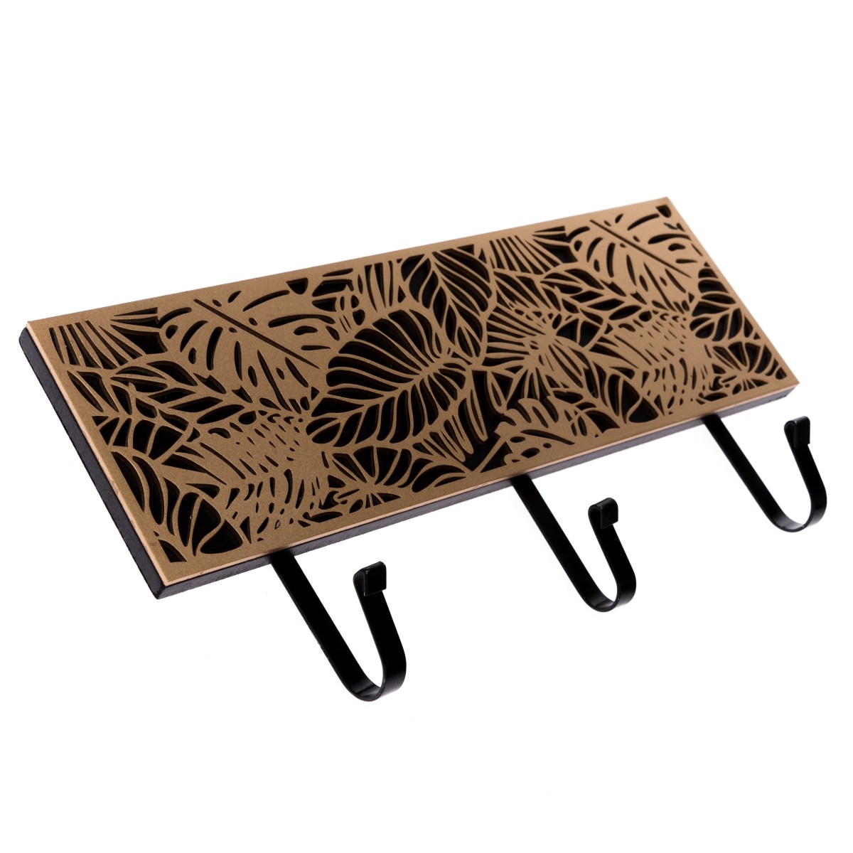 Vešiak na kľúče z dreva má elegantný dizajn. Krásny bytový doplnok z neho robí kontrastné zdobenie tvorené zlatým reliéfom listov rastlín.