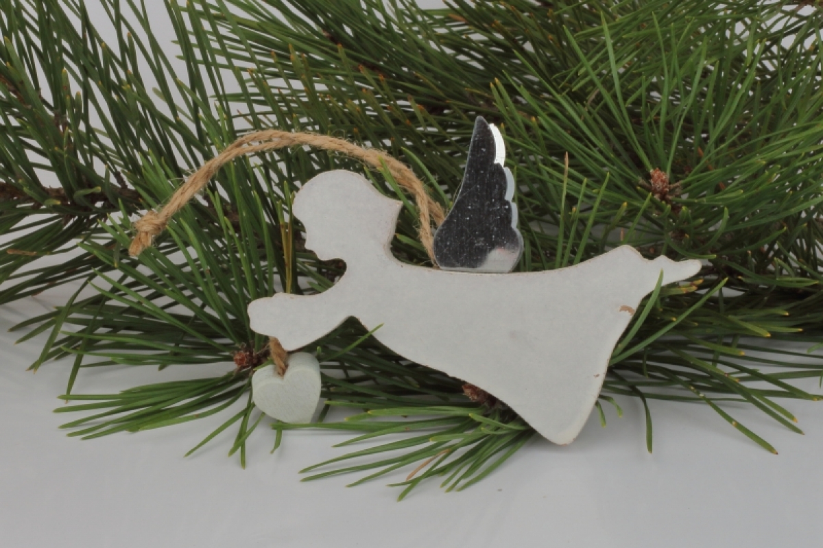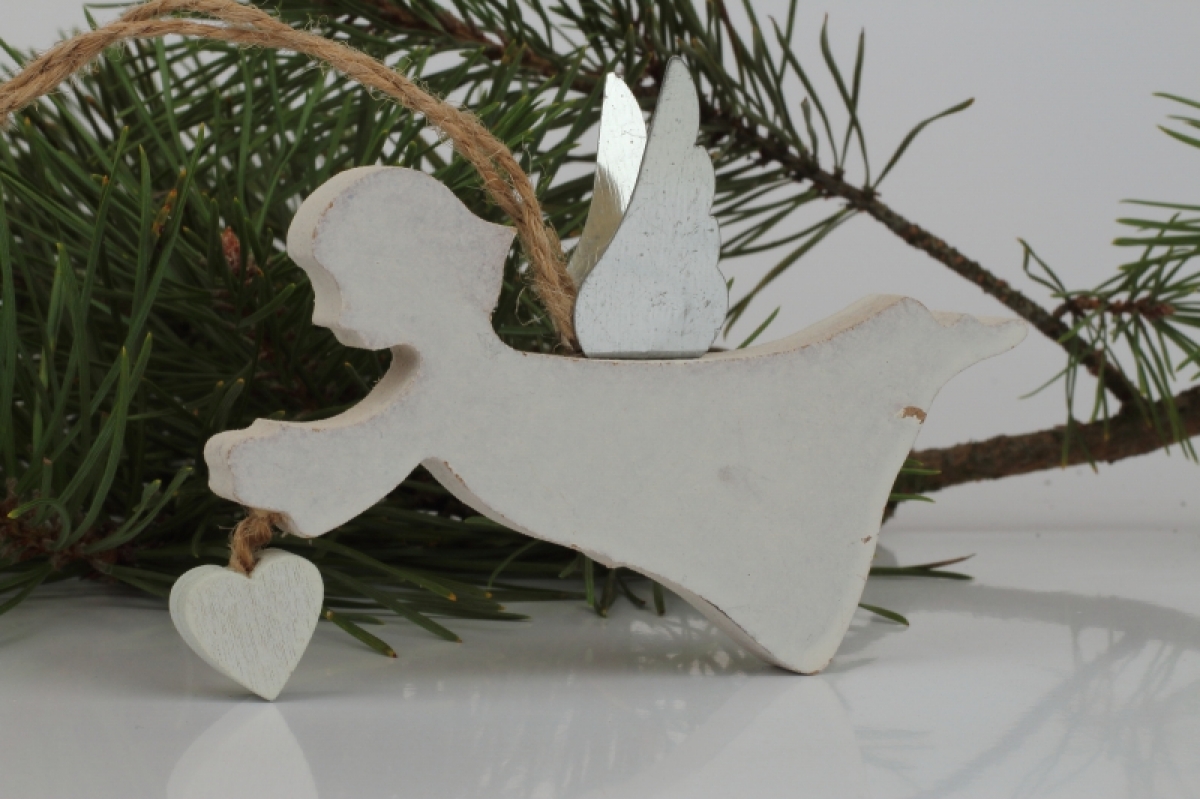 Biely závesný anjelik drží v rukách srdiečko na provázku.