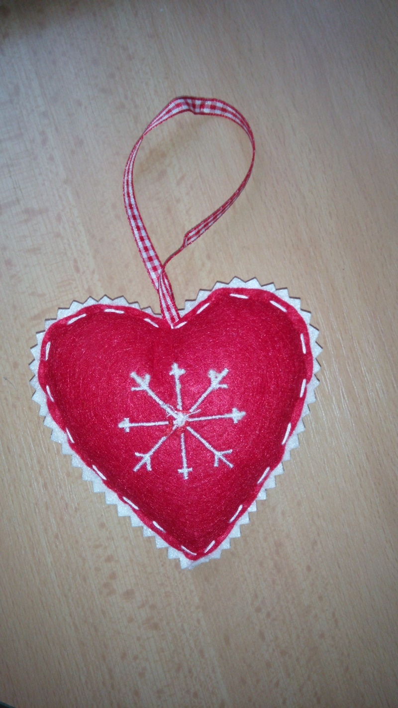 Vianočná ozdoba v tvare srdca. Krásne ozdoby na vianočný stromček v rustikálnom štýle. Ozdoby sú z červenej látky, prešívané bielou niťou s motívom vločky, ktorá je doplnená o drevený gombík. Srdce je zavesené na stužke s kockovaným motívom.