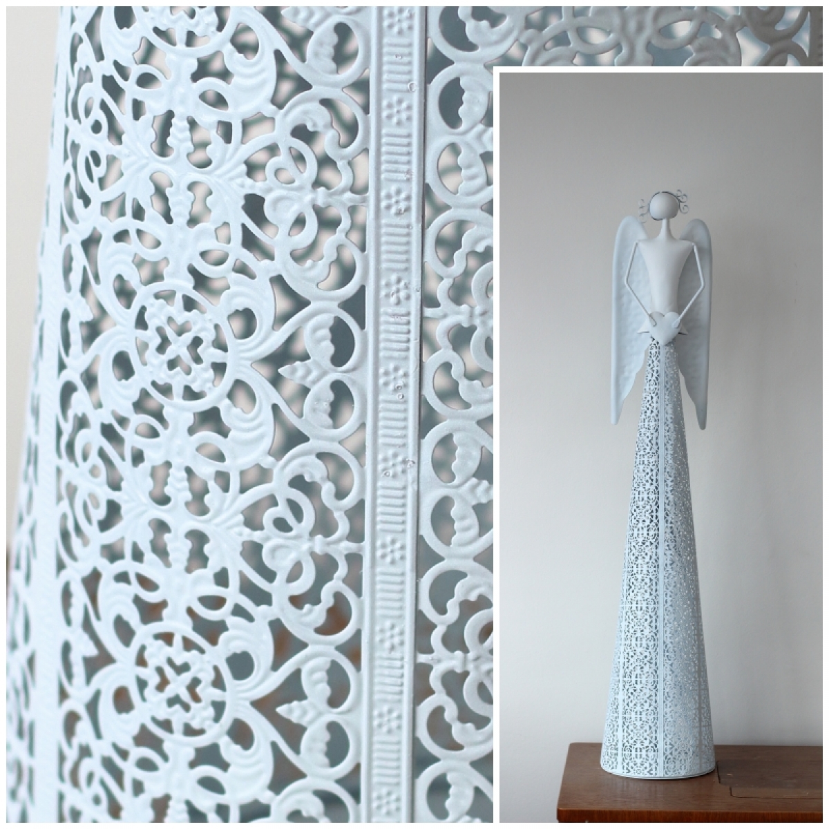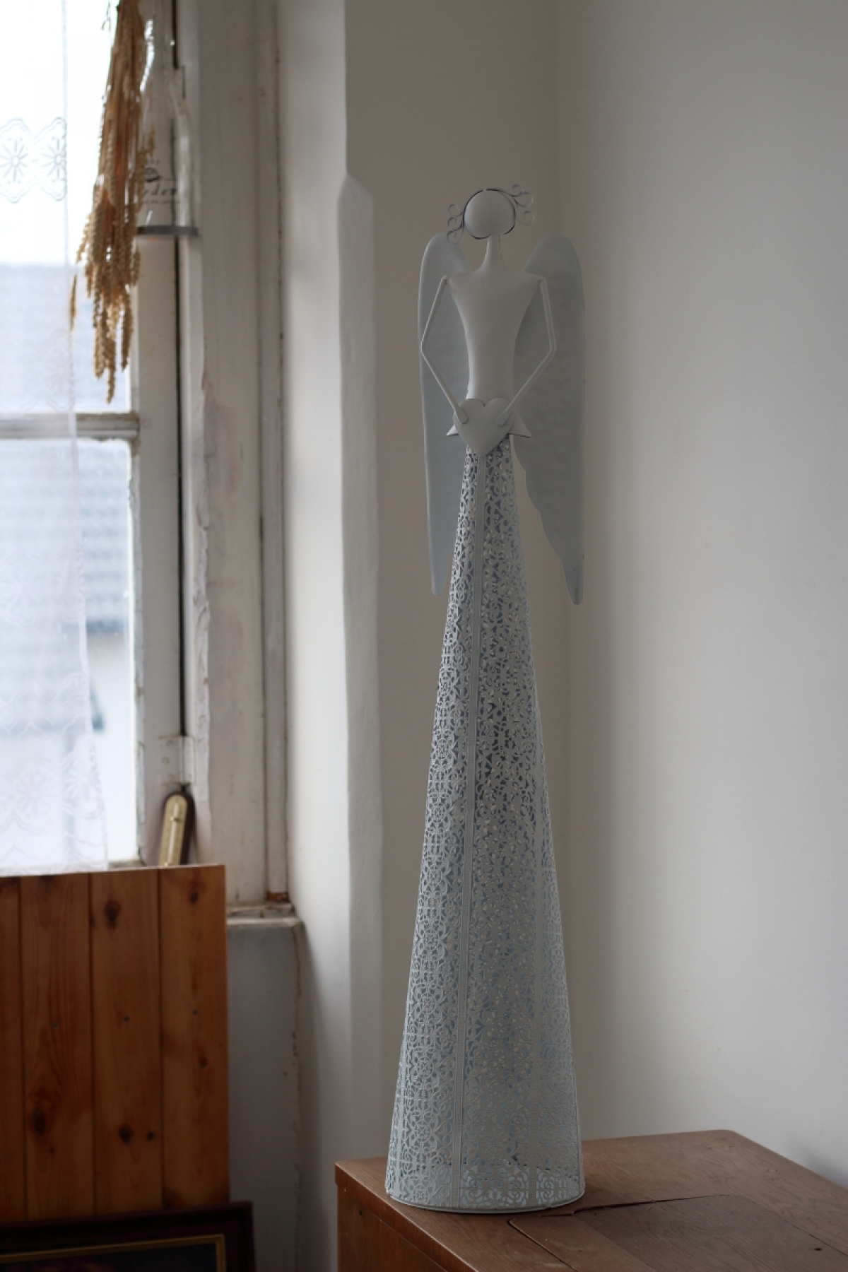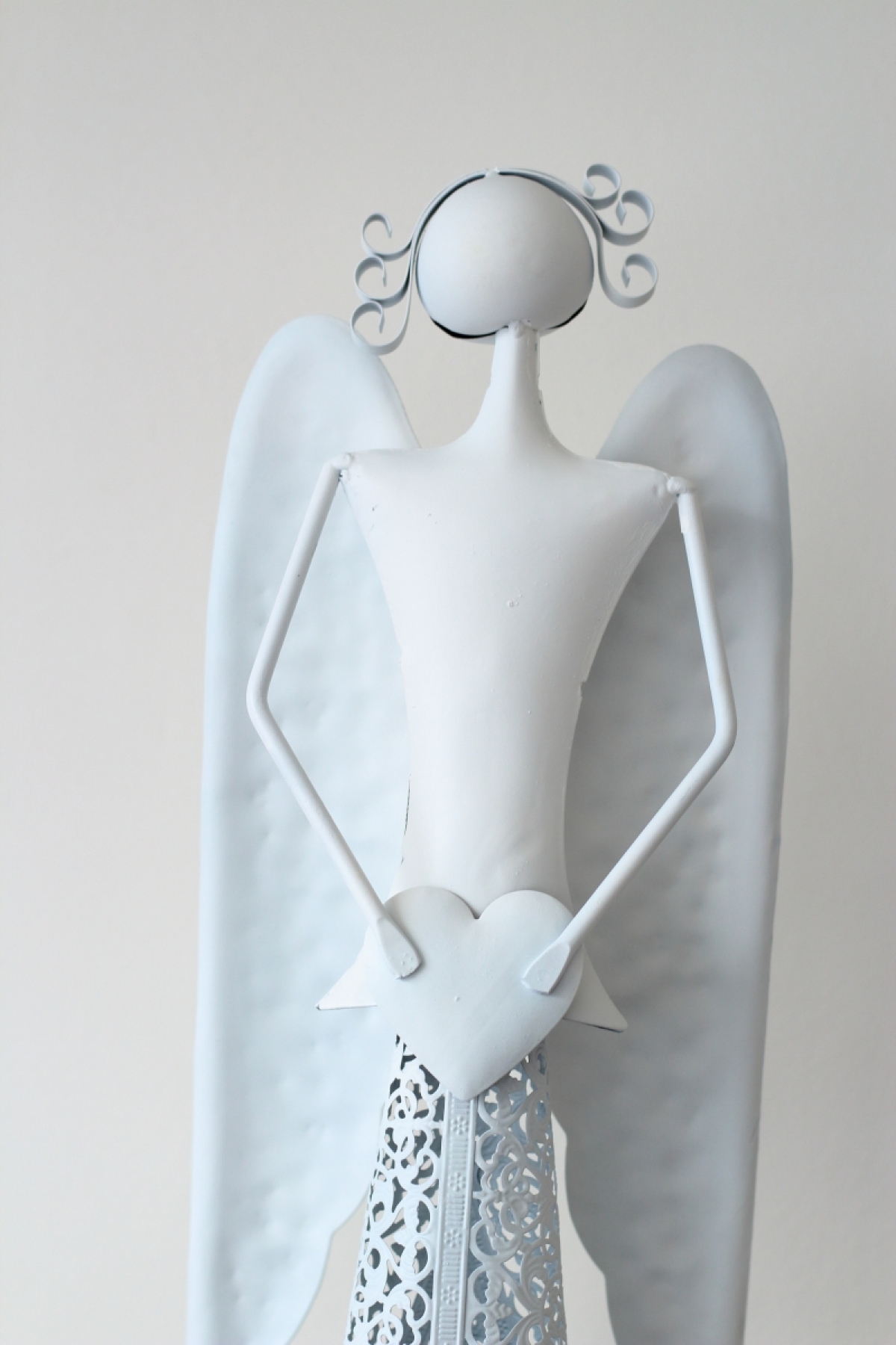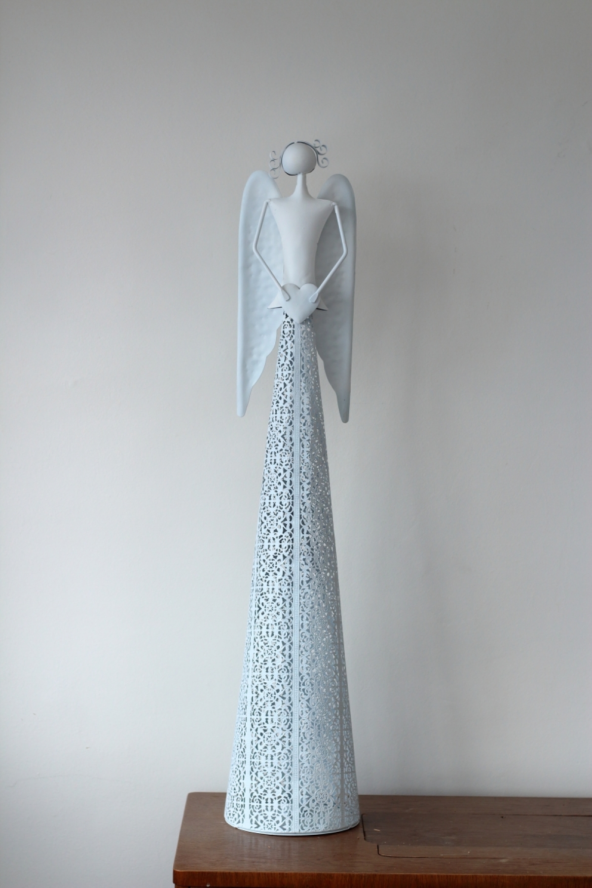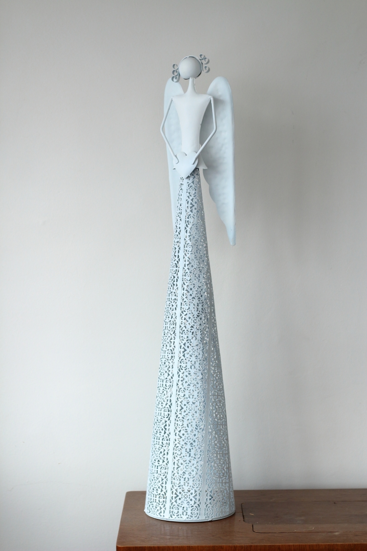 Vianočná výzdoba inšpirácie - kovový anjel vysoký 98,5cm sa srdcom má v spodnej časti otvor pre bezpečné uloženie a zapálenie čajivé sviečky.