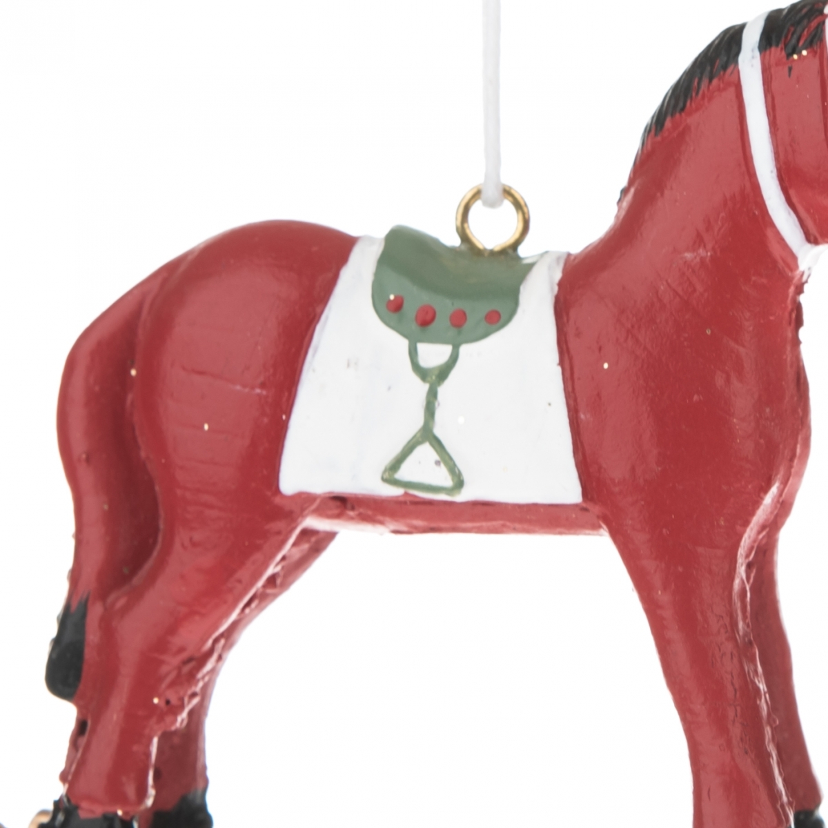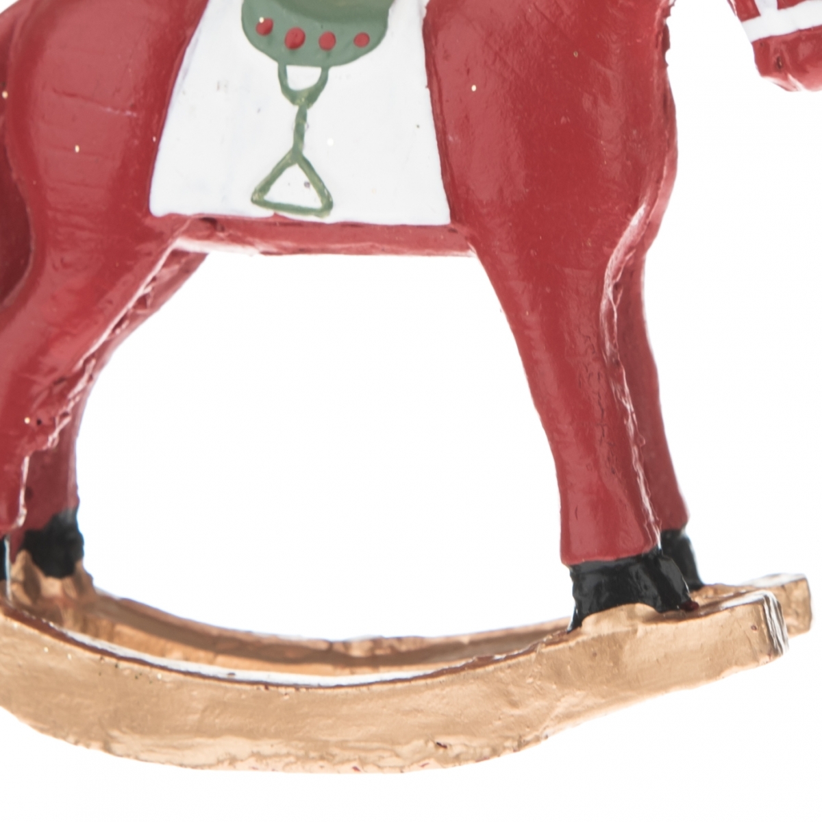 Vianočnú dekoráciu môžete postaviť na rovnú podložku komody, alebo priamo ako vianočnú ozdobu na stromček. Hojdací koník je opatrený stuhou pre ľahké zavesenie.