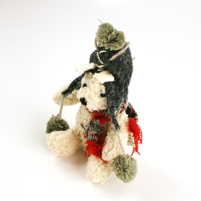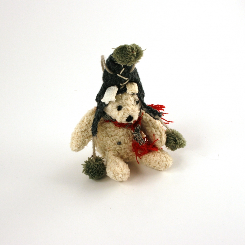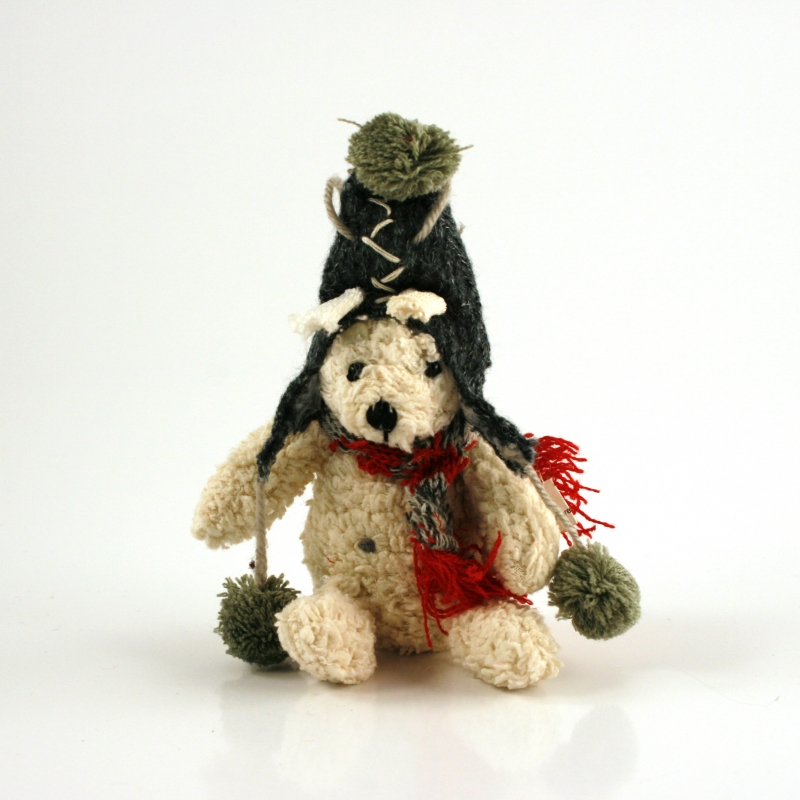 Roztomilý medvedík na fotografiu túto skutočnosť potvrdzuje, veď komu by sa nepáčil. Jeho chlpaté telíčko je mäkké a hrejivé. Na hlave má vysokú čiapku s brmbolcom a okolo krku si uviazal šál.
