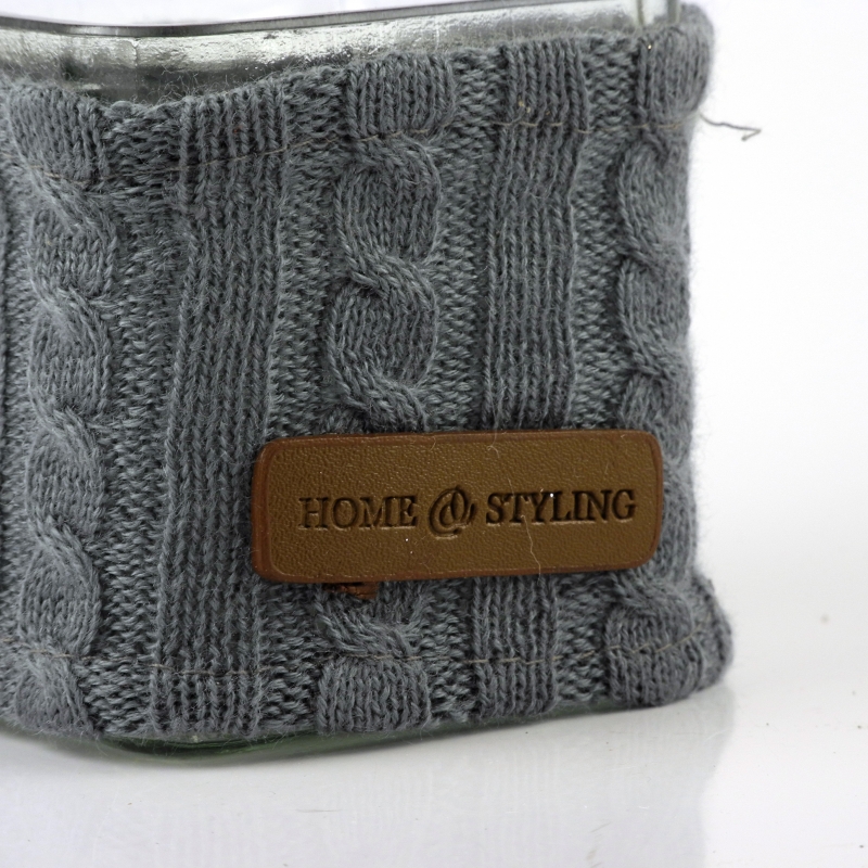 Rozměry: skleněný kalíšek 7.5x7.5cm o výšce 8cm. Pletený návlek z vlny a kožené ozdoby s nápisem HOME STYLING
