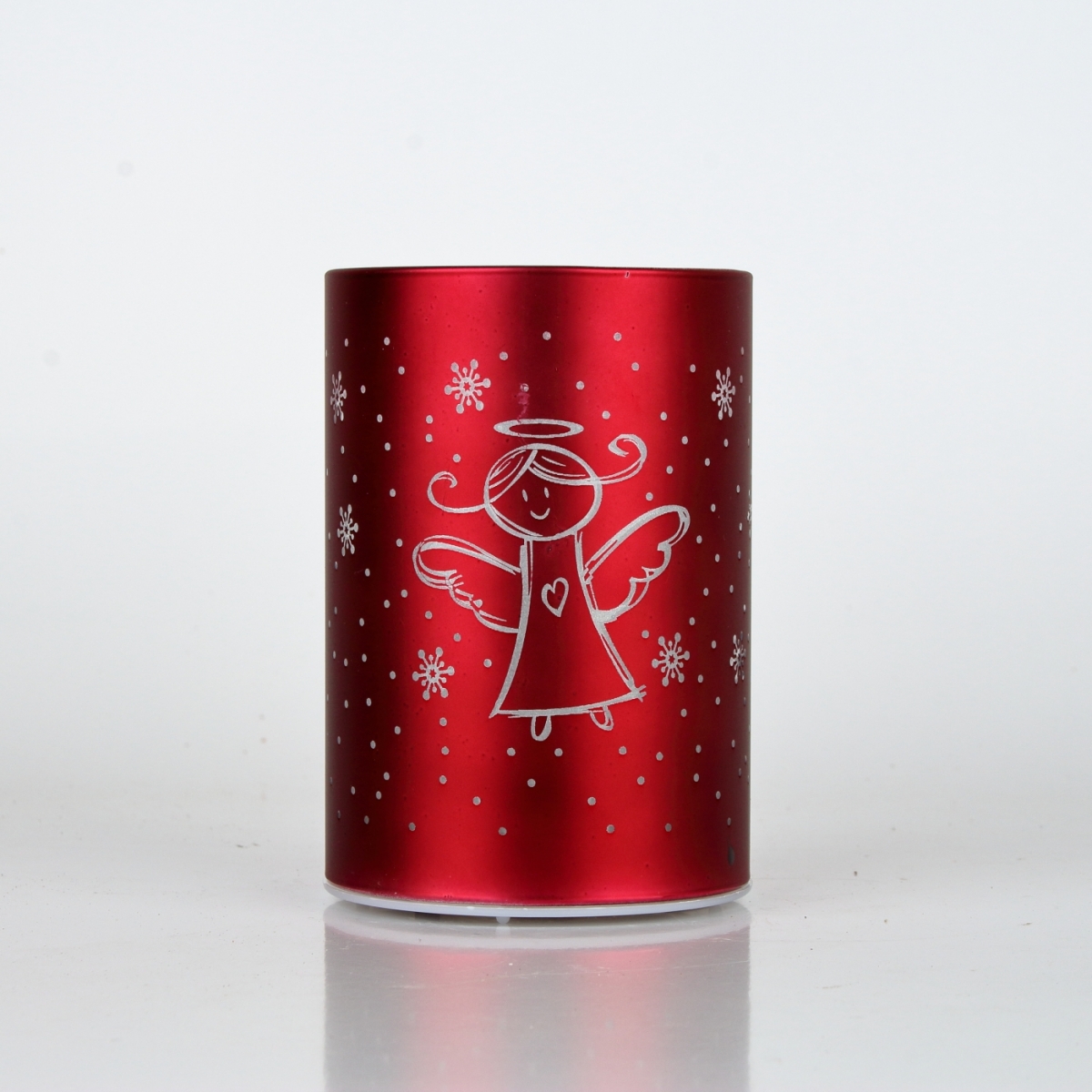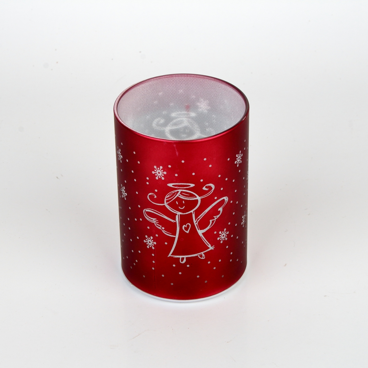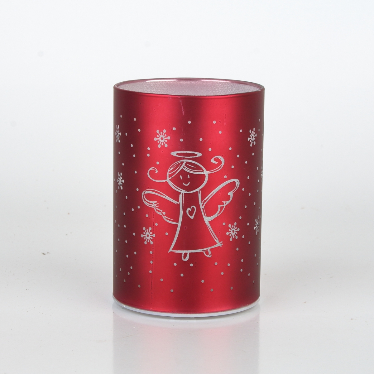 Vianočný LED svietnik zo skla v červenej farbe s motívom anjela