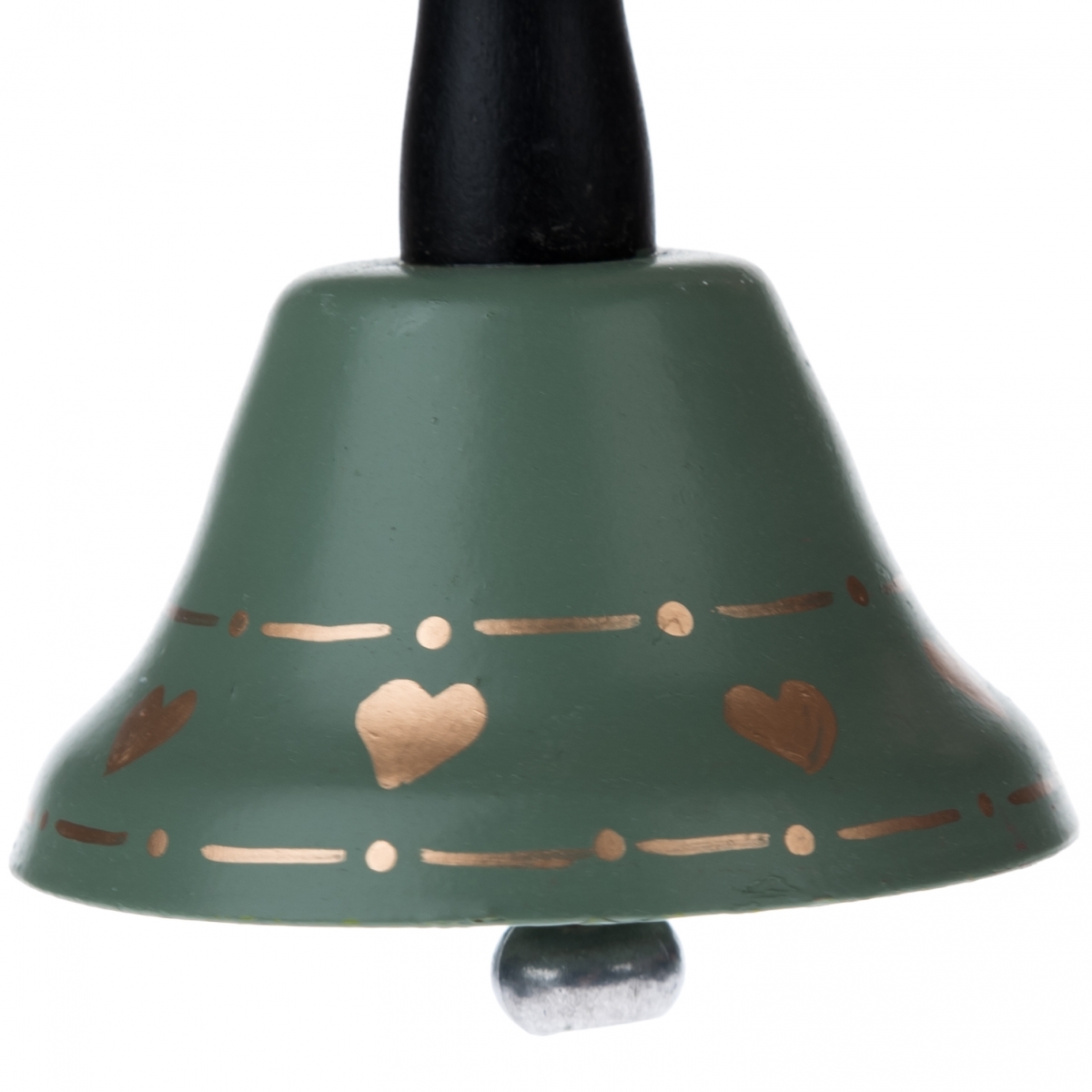Vianočný zvonček v zelenej farbe má zlaté zdobenie s nežnými srdiečkami.