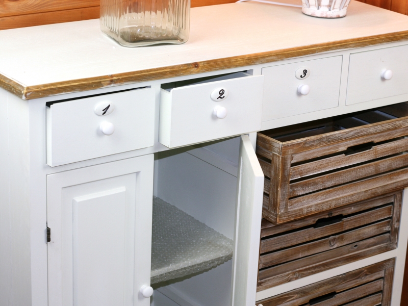 V hornej časti má komoda štyri praktické šuplíky. Ďalej je rozdelená na časť, ktorá je opatrená bielymi dvierkami, a časť, ktorú tvoria tri praktické zásuvky. Tým je ponechaný prirodzený vzhľad dreva. Dvierkami prúdi do vnútorného priestoru čerstvý vzduch.