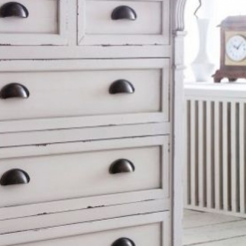 Komoda o rozmeroch 80x88x40cm s bielou patinou má kontrastný úchytky v tmavej farbe.