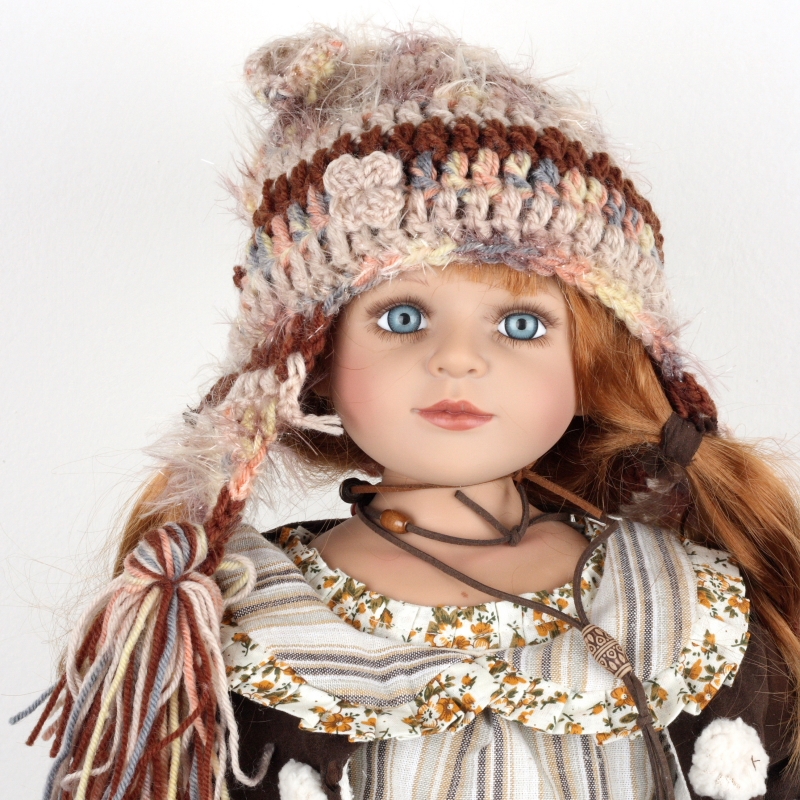 Bábika má dlhé plavé oči a blankytne modré oči. Okolo krku má ozdobný koženkový špagát s korálkami.