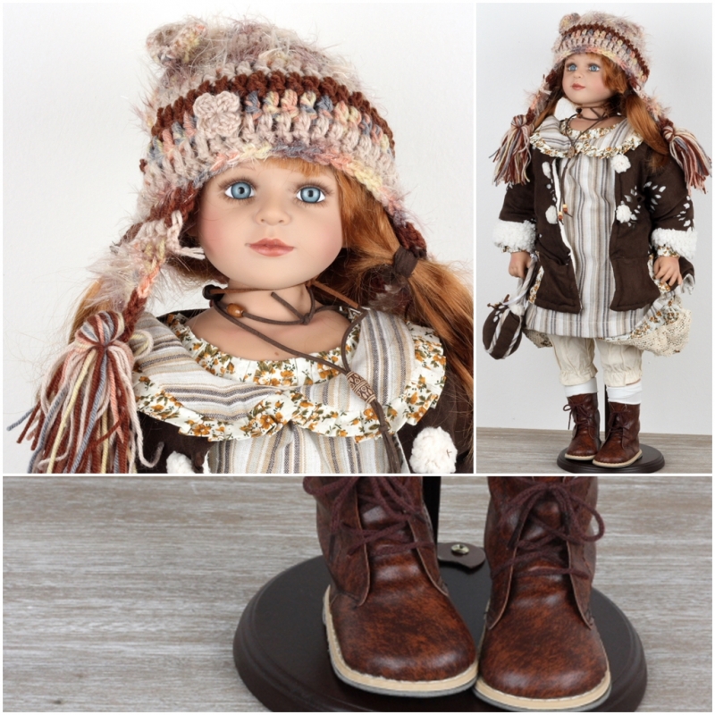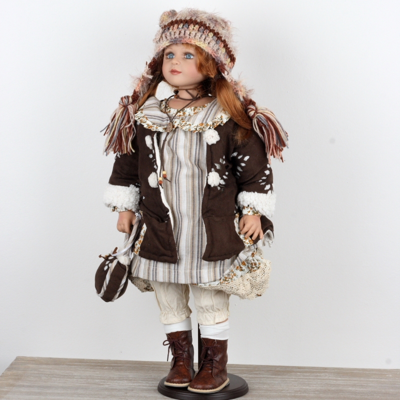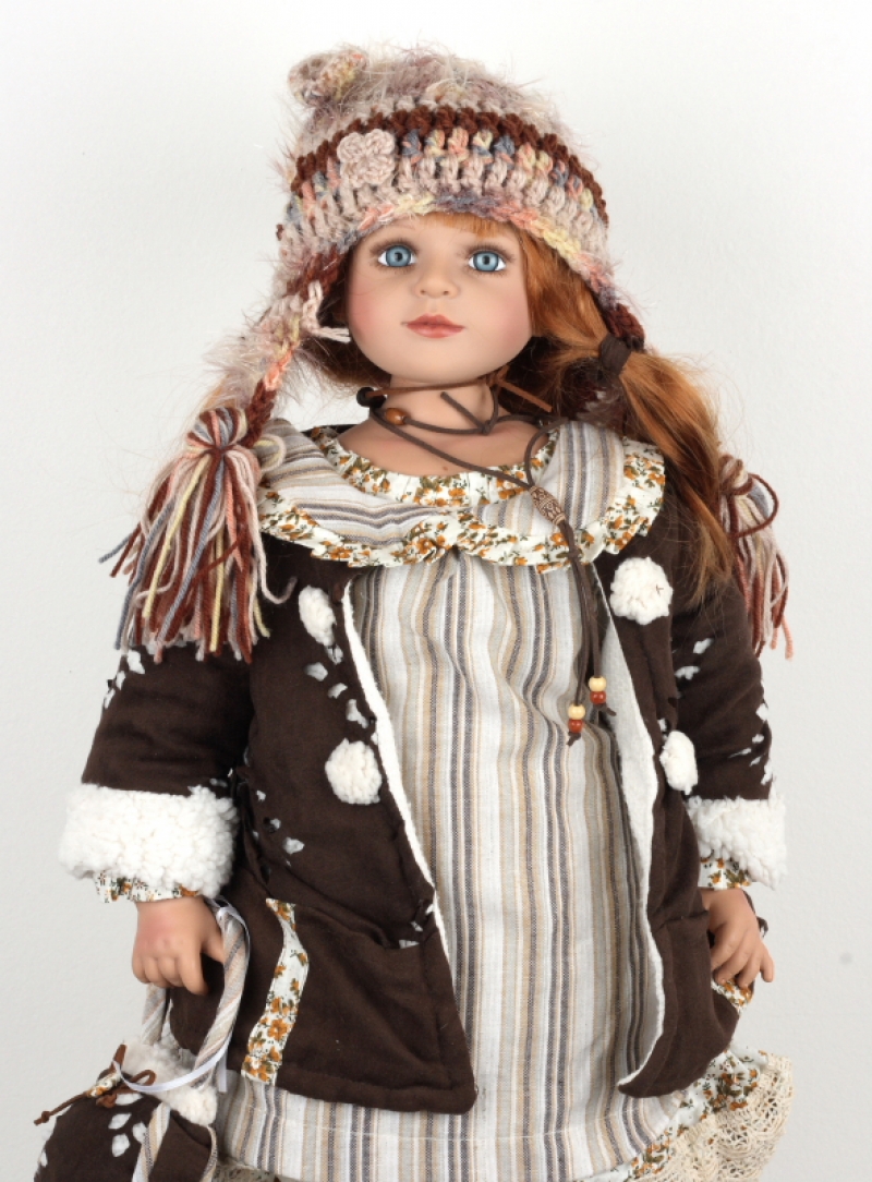 Vinylová bábika Agáta 72cm s teplou pletenou čiapkou, kabátom a taštičkou v ruke.