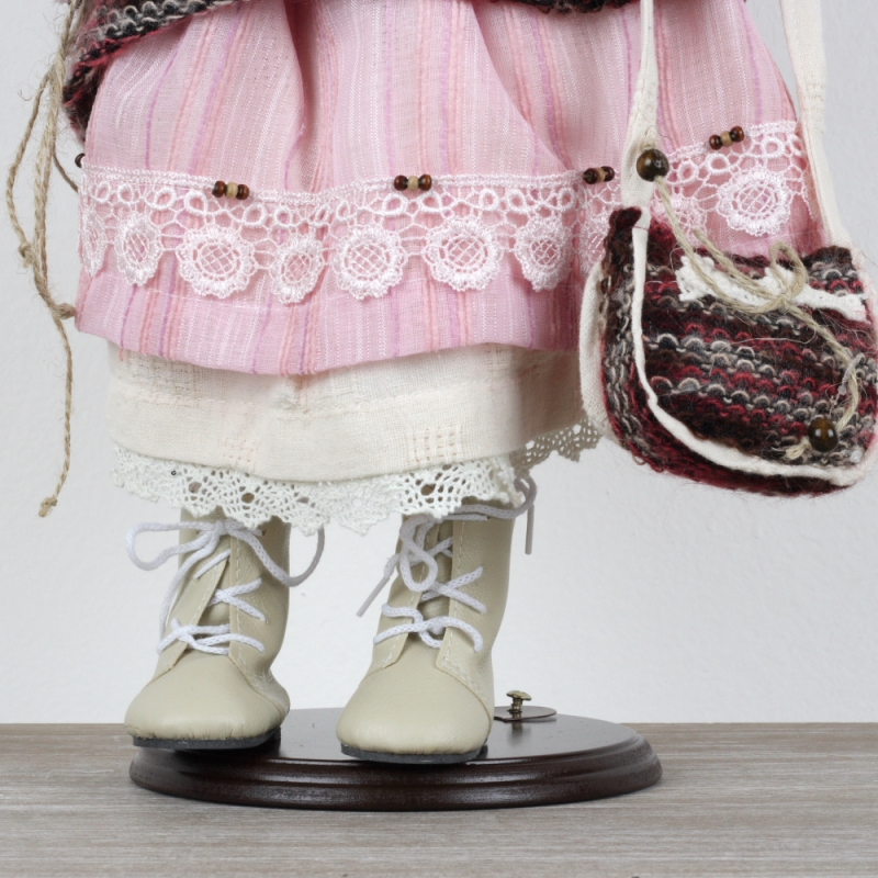 Vinylová bábika je vsadená do stojanu, ktorý je súčasťou balenia.