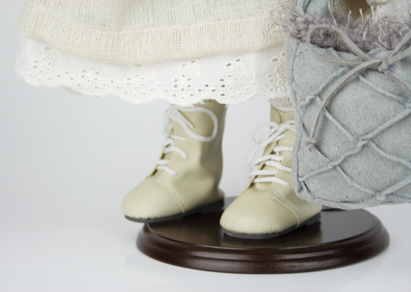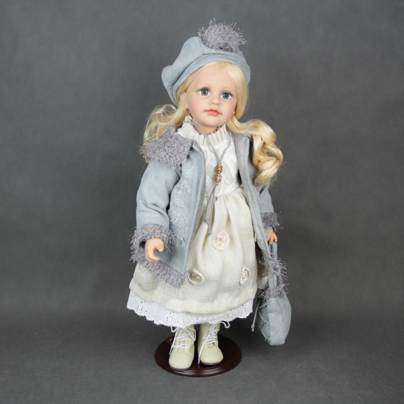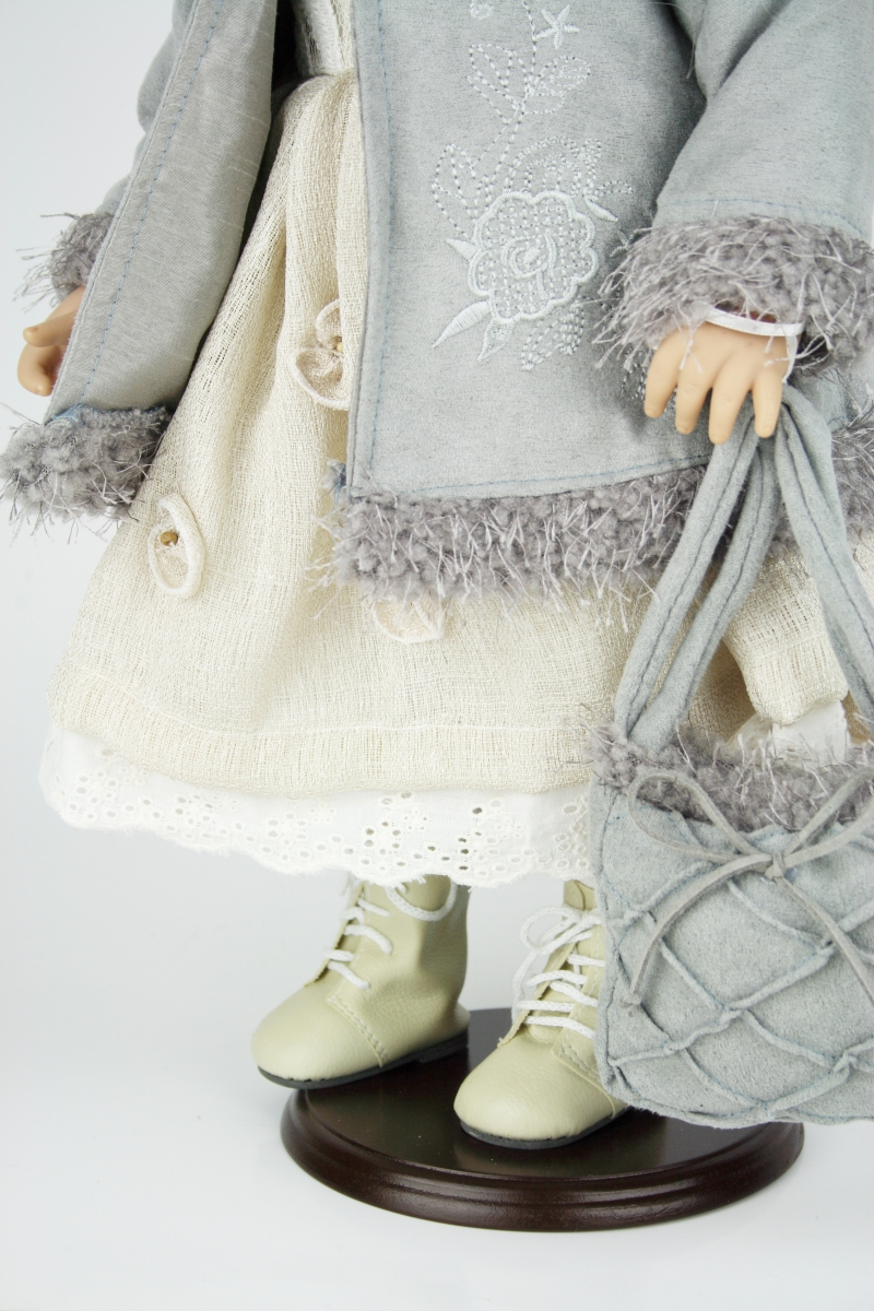 Vinylová bábika menom Mia meria 53cm. Je oblečená do bielo-hnedých šiat s čipkovanými aplikáciami a do šedého kabátika, ktorý je lemovaný kožušinkou. Ku kabátiku ladí čepiec aj kabelka.