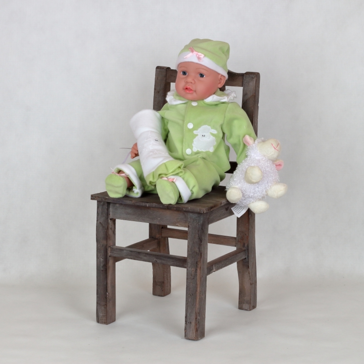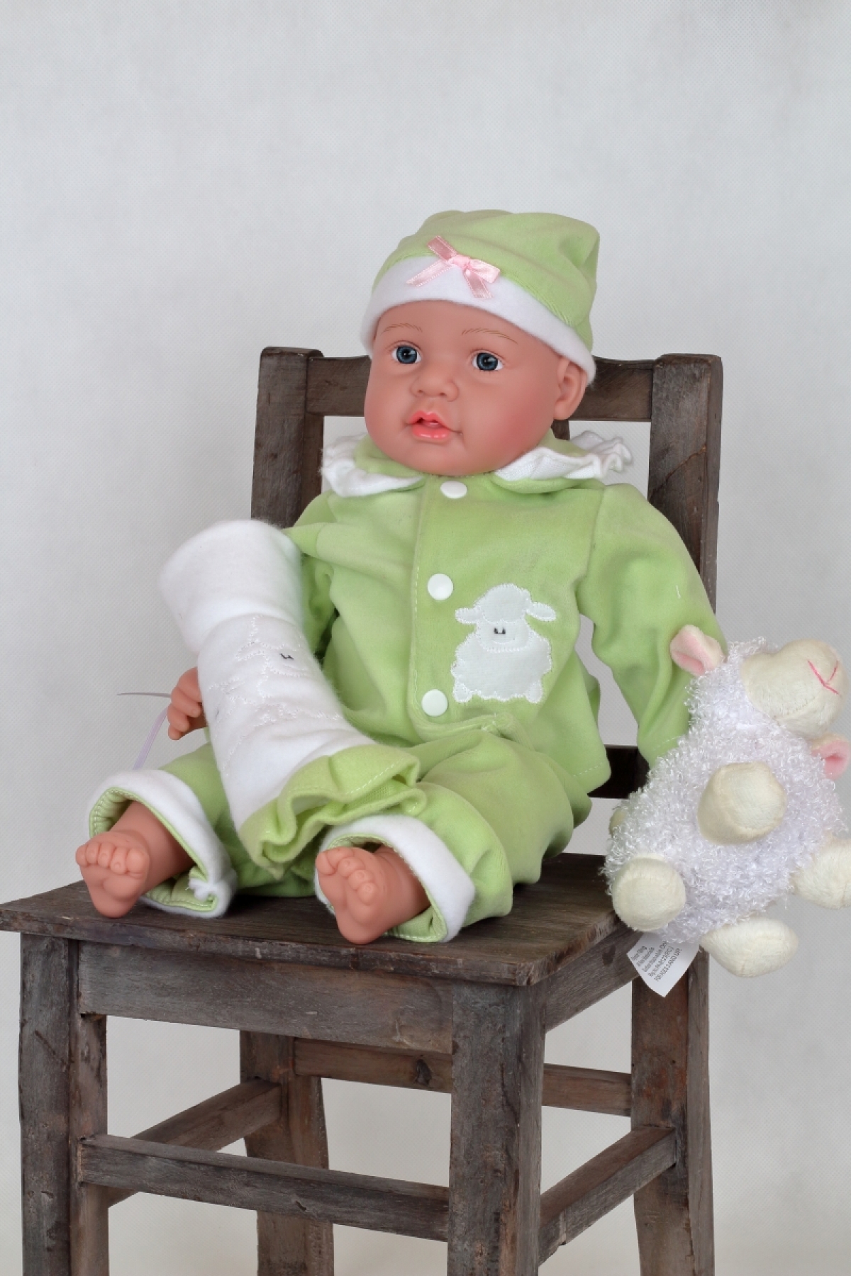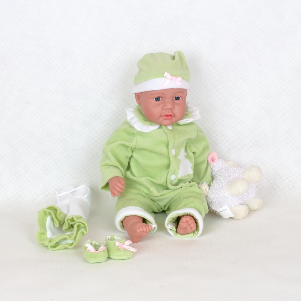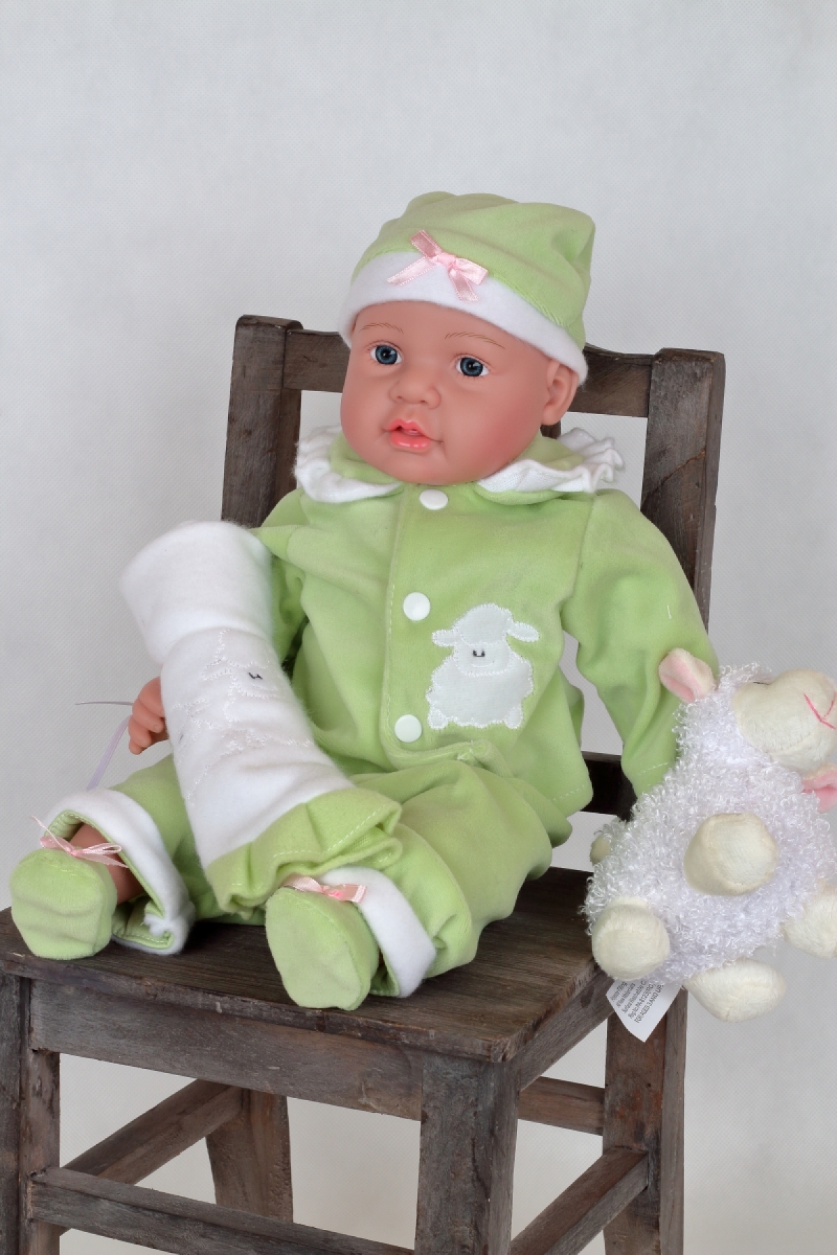 Realistická bábika má zelené dupačky, čiapočku, malú deku a v ruke ovečku.