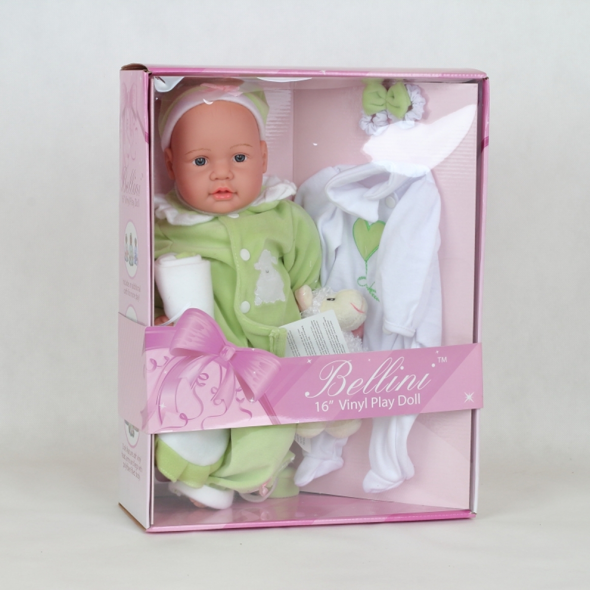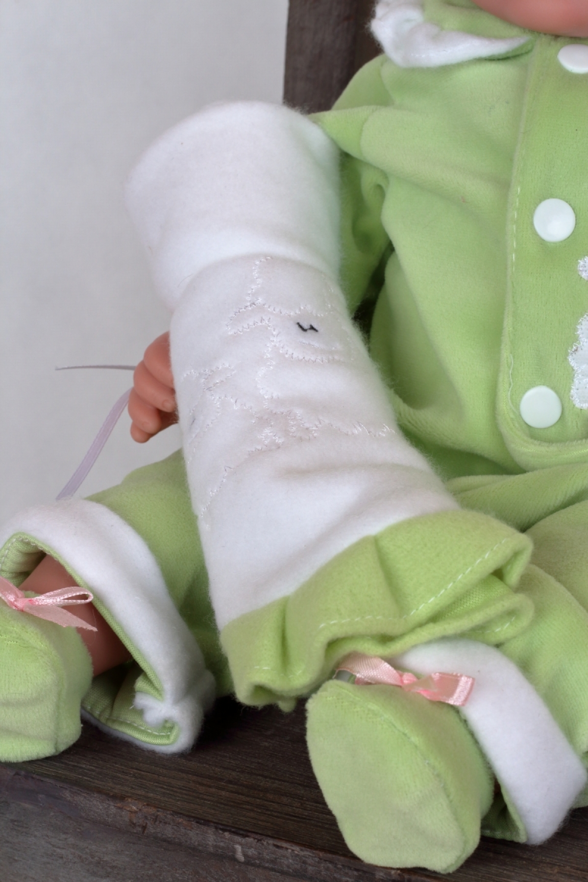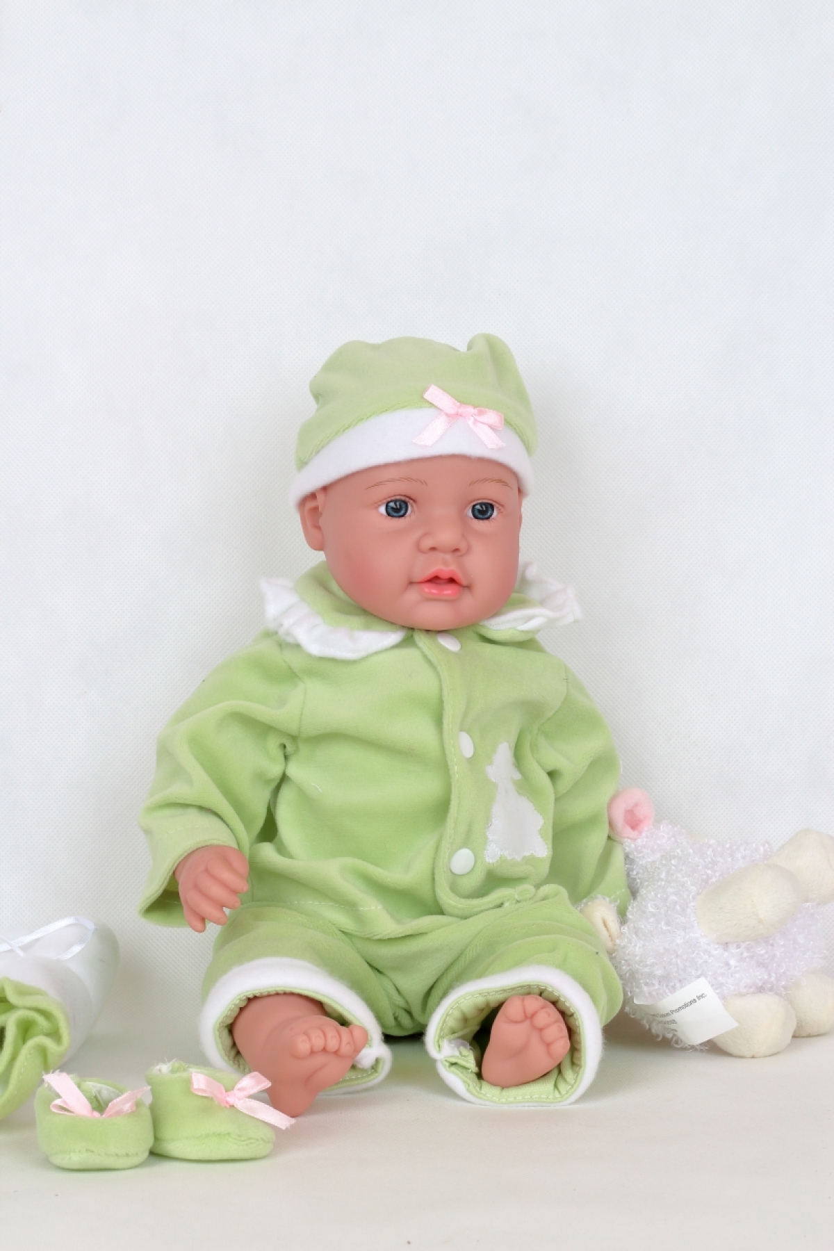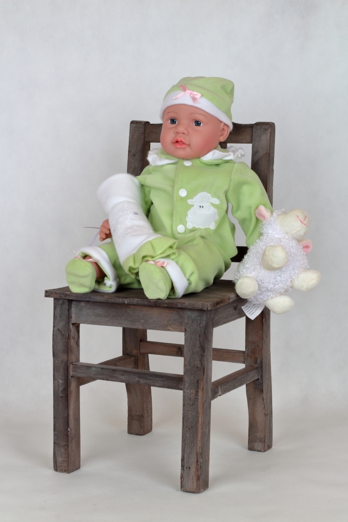 Realistická bábika má zelené dupačky, čiapočku, malú deku a v ruke ovečku.