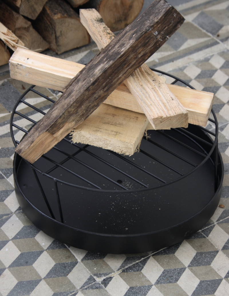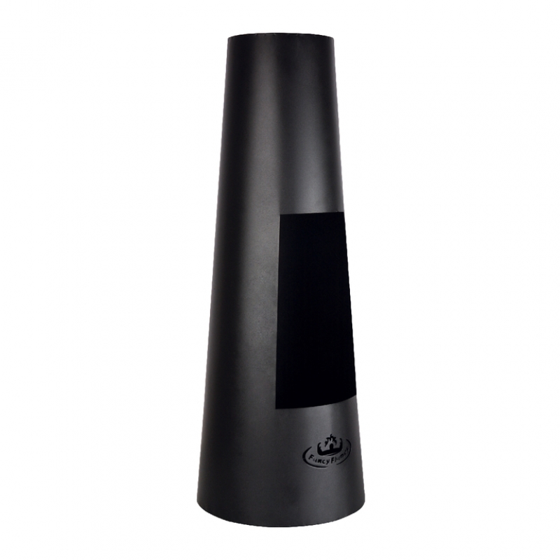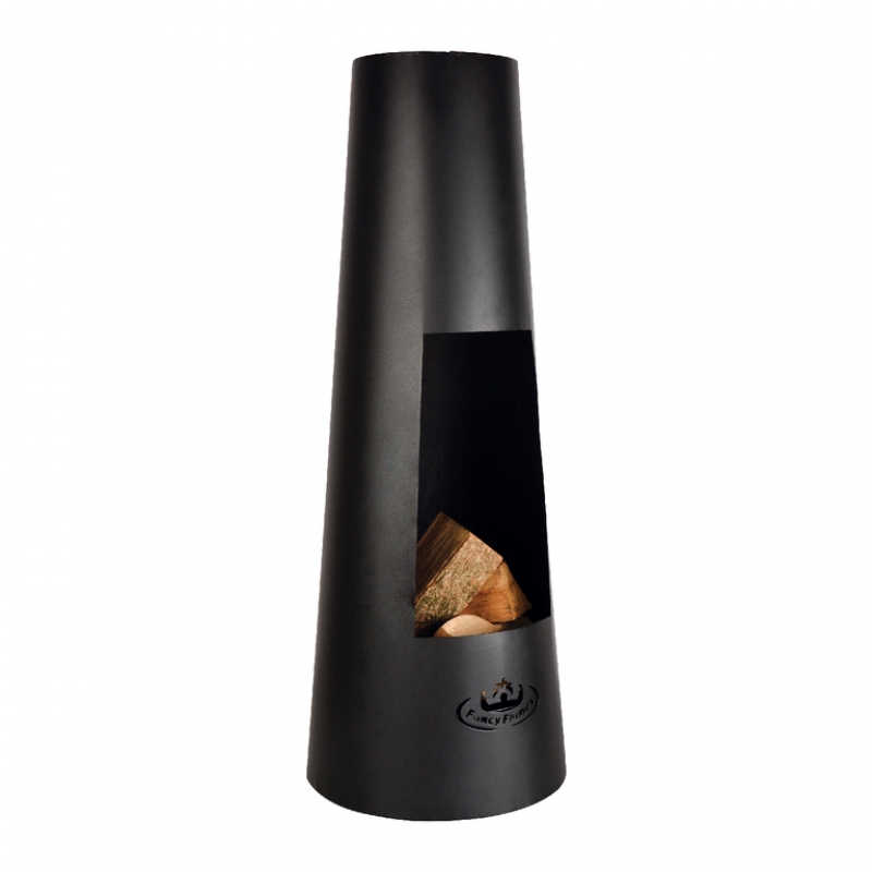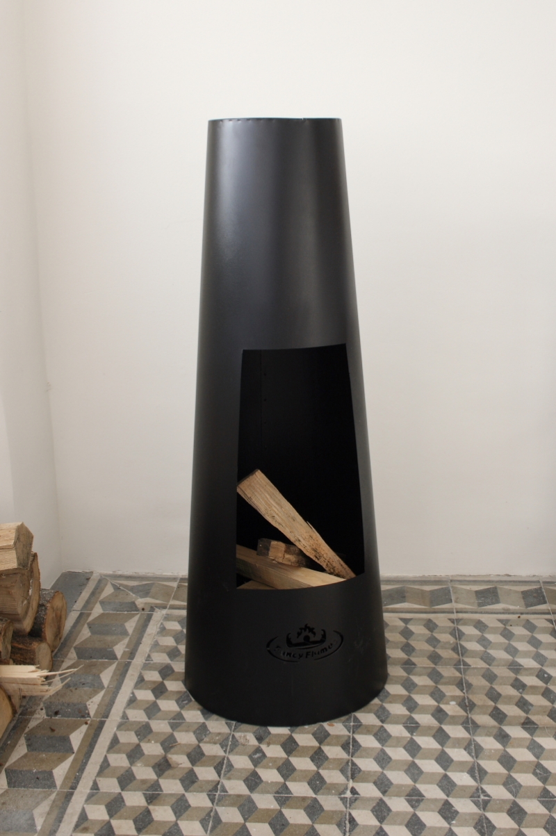 Vonkajší krb je celokovový v tvare komína, krb má vnútri praktický rošt na drevo a misku na popol.