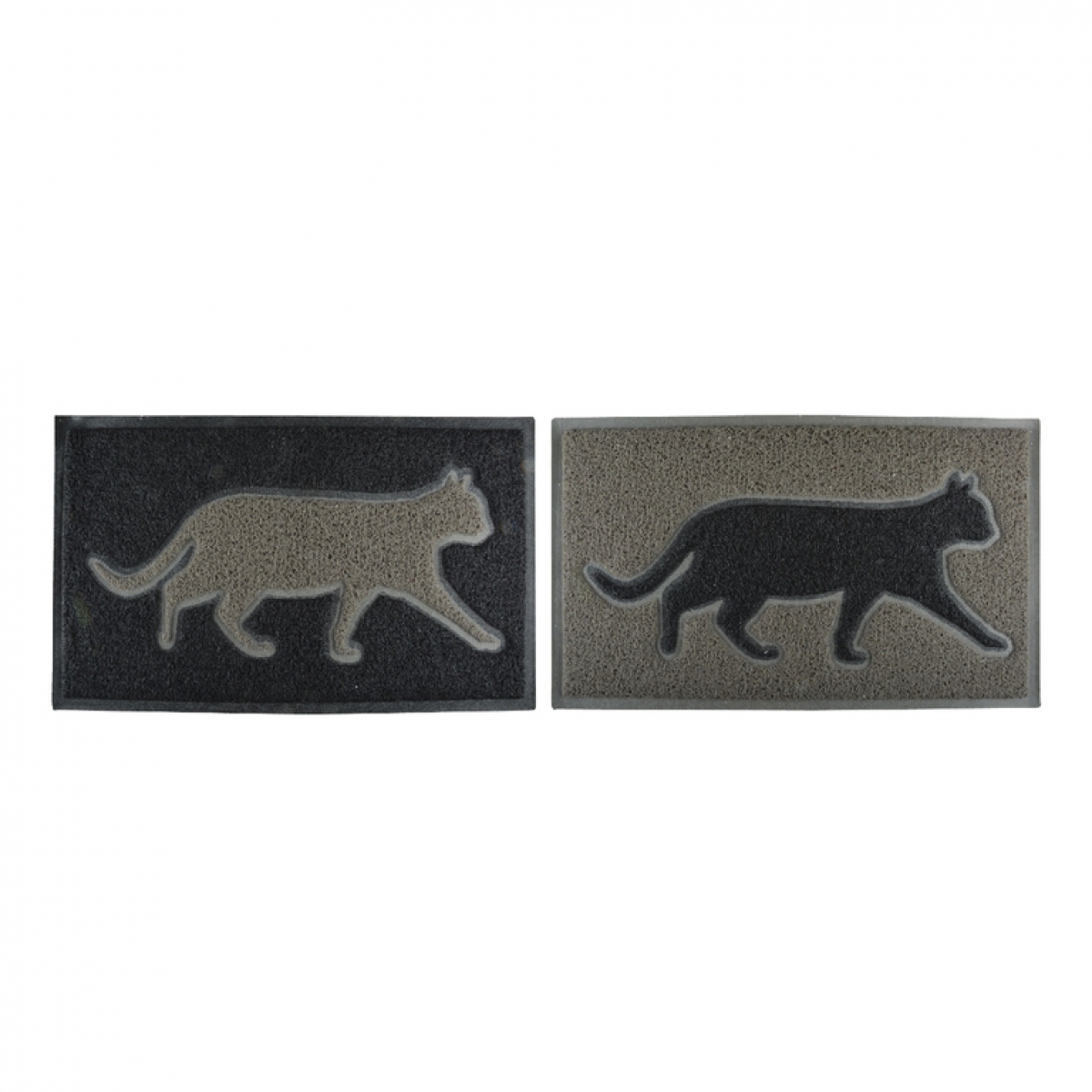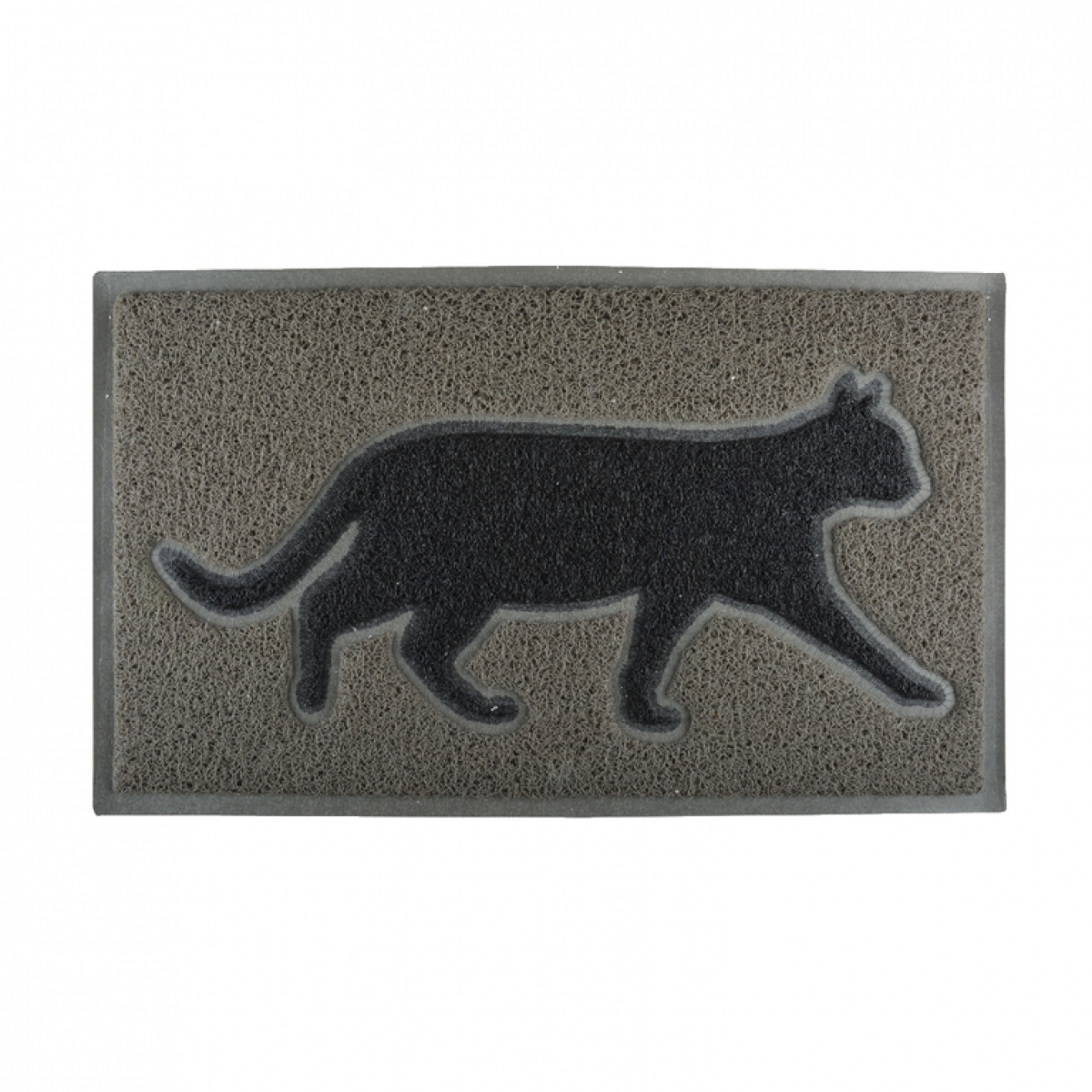 Vonkajšia rohožka sivá s čiernym obrázkom mačky.