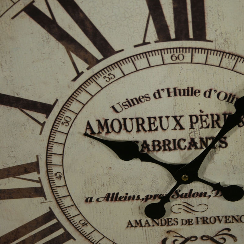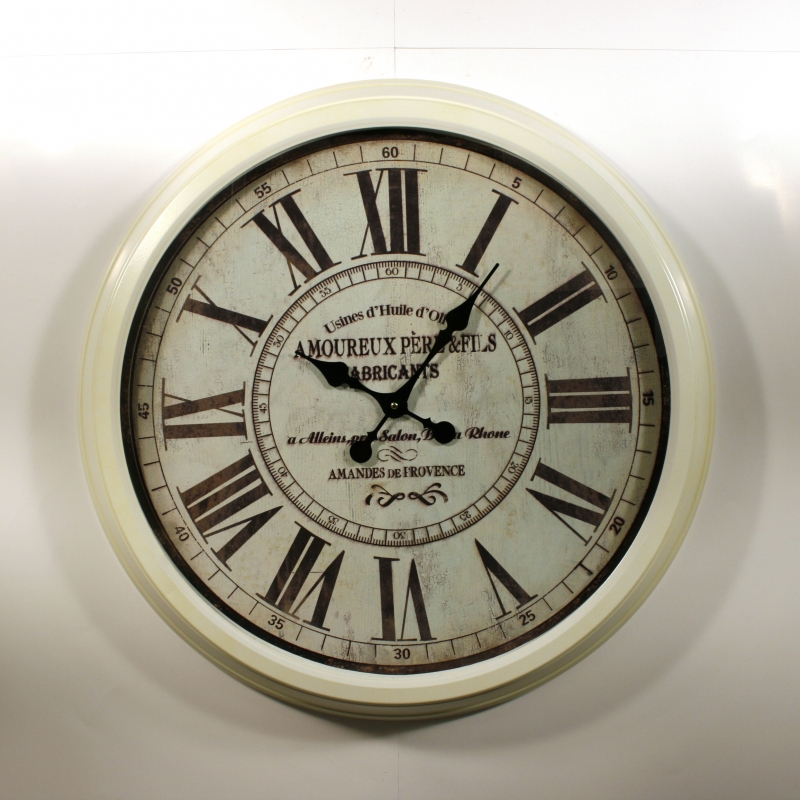 Hodiny nástenné sú vyrobené z bieleho plechu . Jedná sa o väčší typ hodiny s priemerom 70 cm . Vďaka svojej veľkosti sa hodí najmä do priestorov , ako sú reštaurácie, bary a ďalšie spoločenské priestory . Bielu farbu hodín narušujú čierne rímske číslice a tiež ozdobné nápisy uprostred ciferníka .