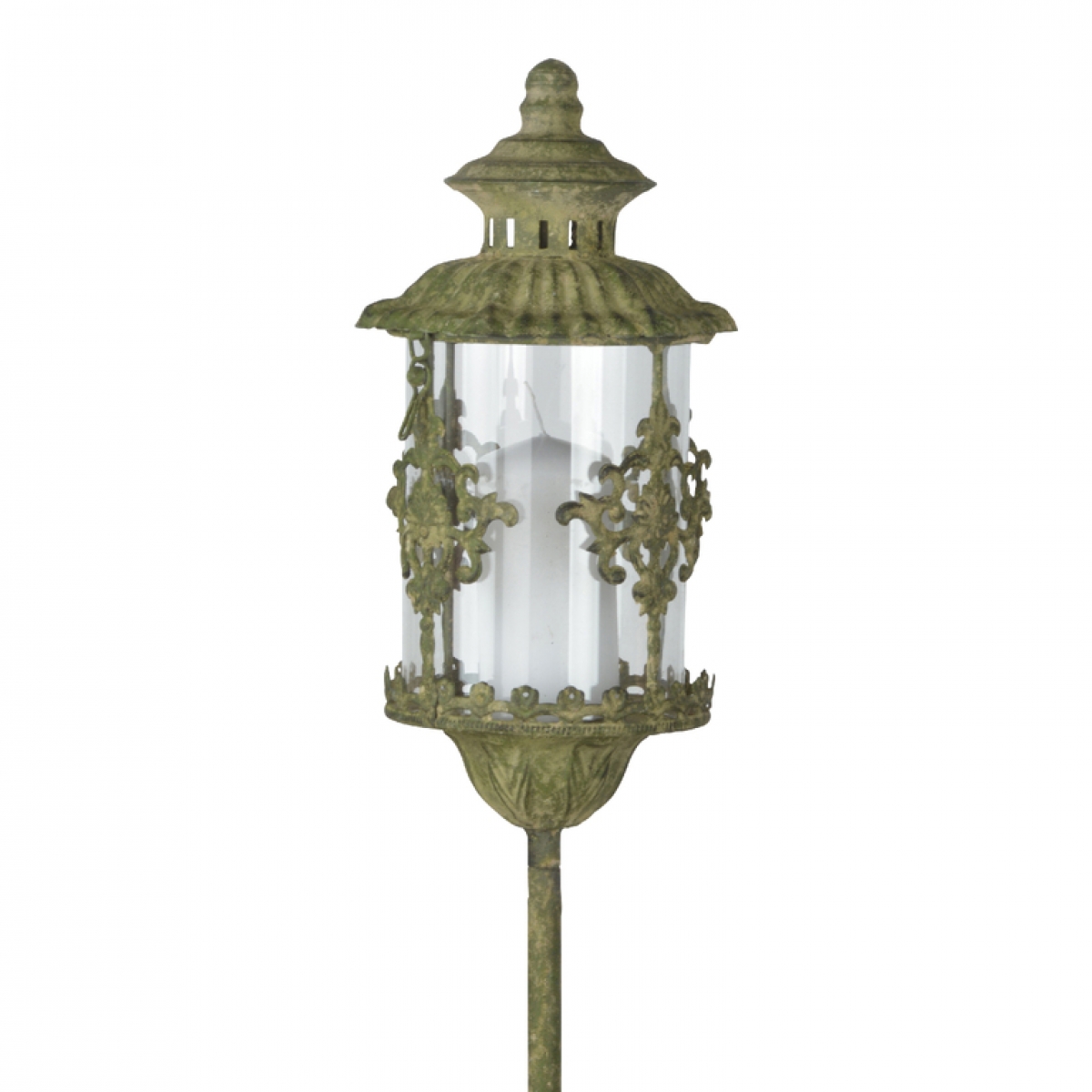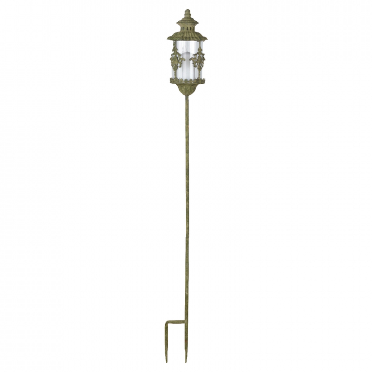 Originálne kovová vonkajšia lampáš pre jednoduché prenášanie a premiestňovanie na záhrade.