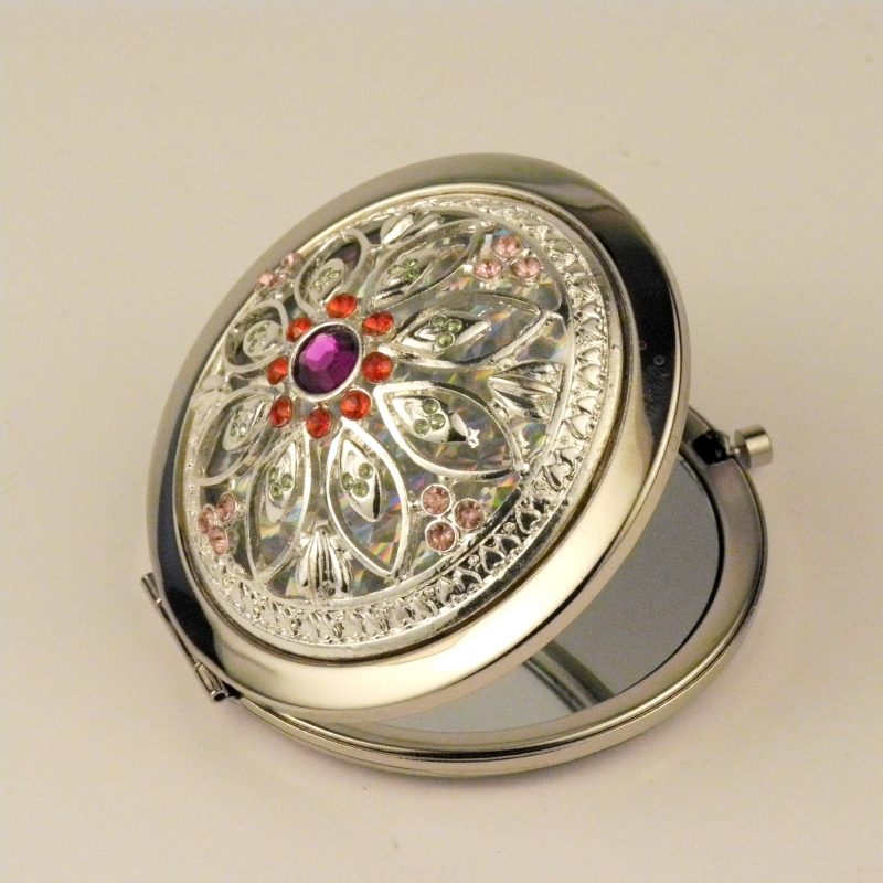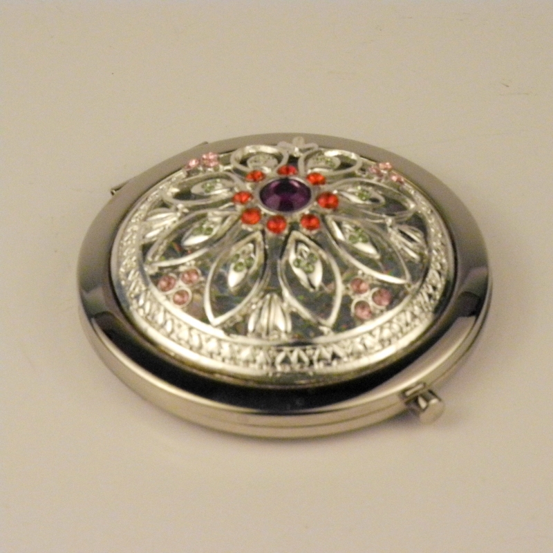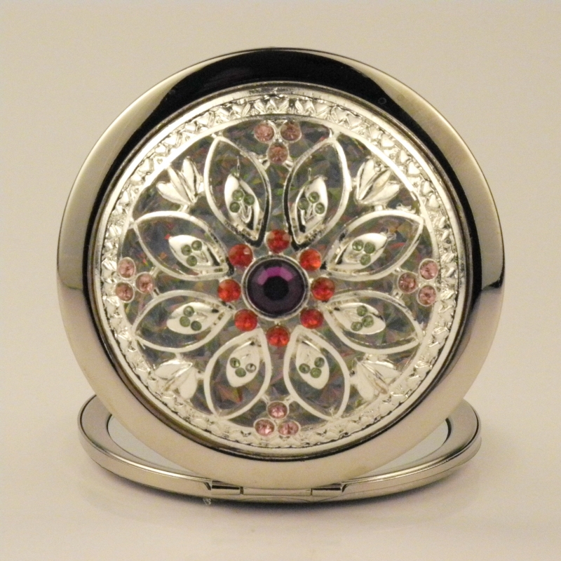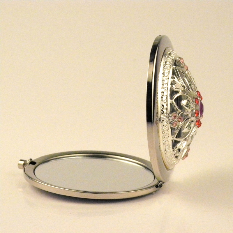 Zrkadlo je bezpečne ukryté v kovovom obale. Elegantný doplnok do spoločnosti.