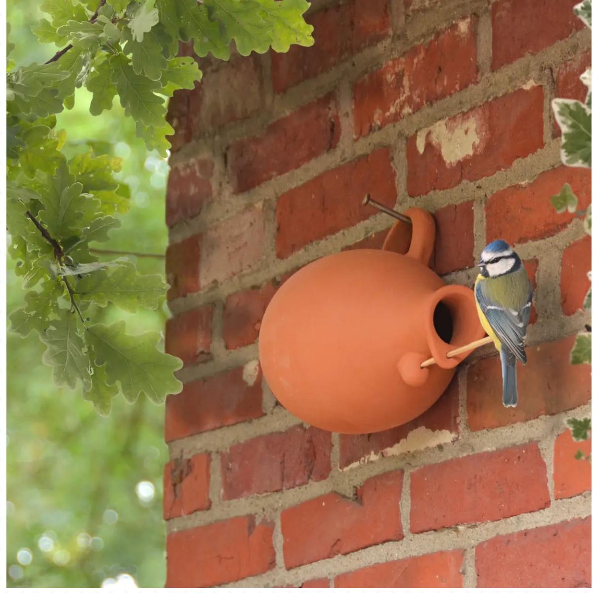 Vtáčia búdka je vyrobená z mrazuvzdorné kameniny, takže vonku vydržia bez úhony aj v chladných zimných mesiacoch. Vďaka uchu na džbánu ide ľahko zavesiť na väčšie klinec alebo vetvu.