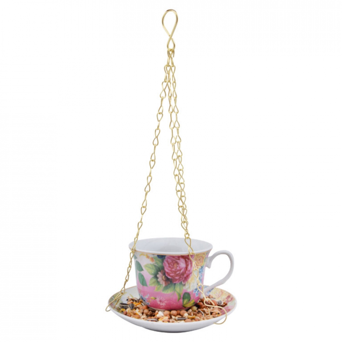 Vtáčie krmítko do záhrady ako hrnček s kvetinami na ružovom podklade