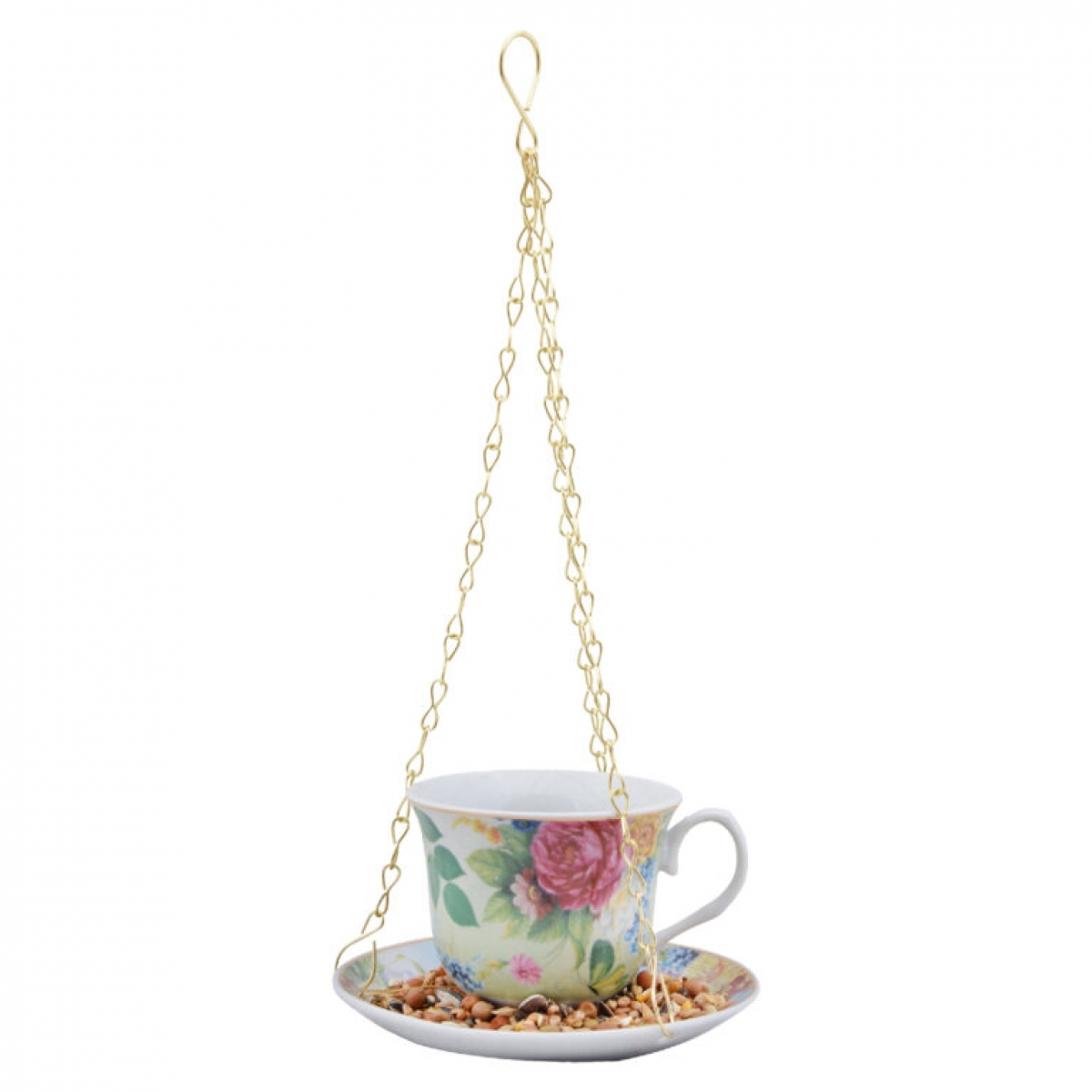 Vtáčie krmítko do záhrady ako hrnček s kvetinovým motívom na zelenom podklade