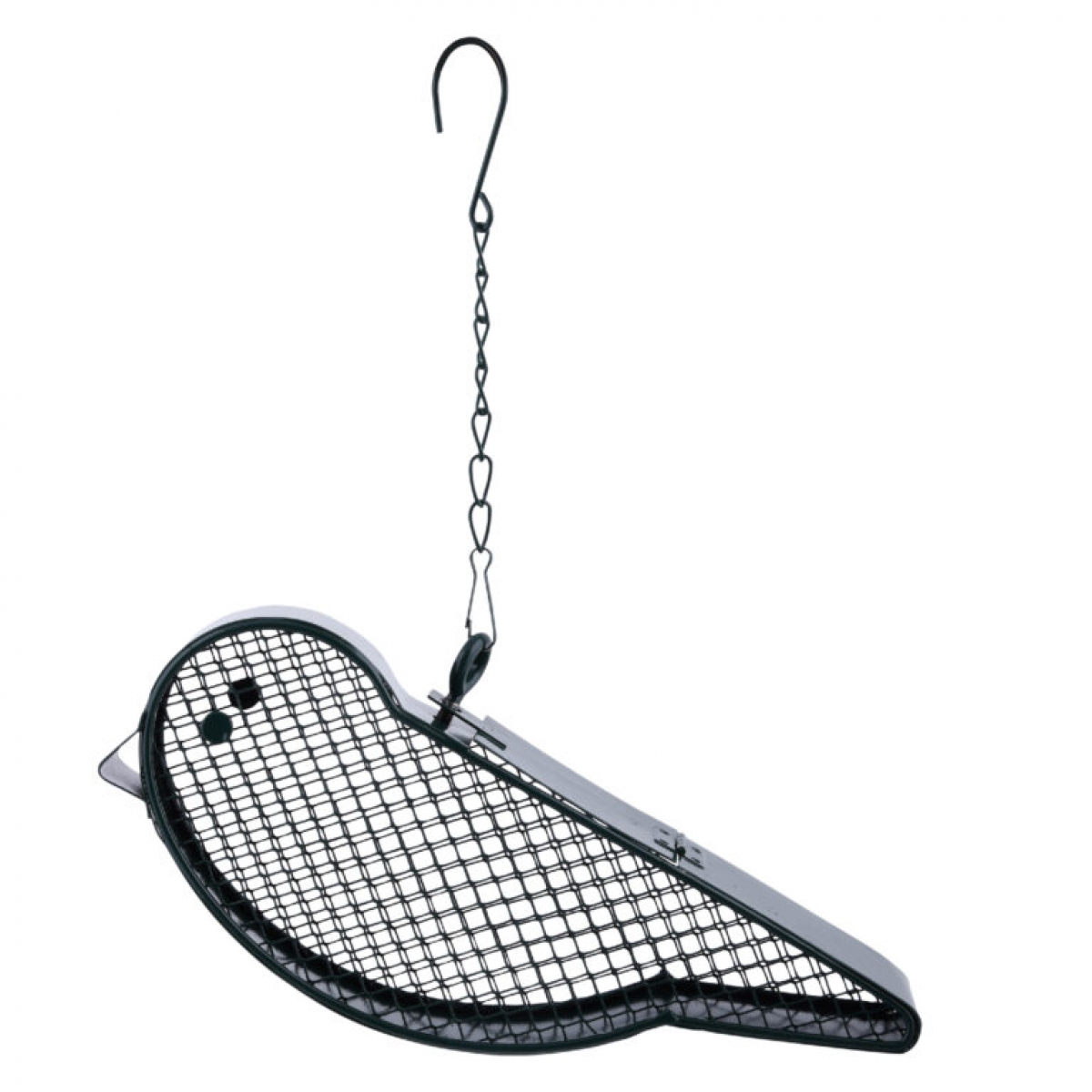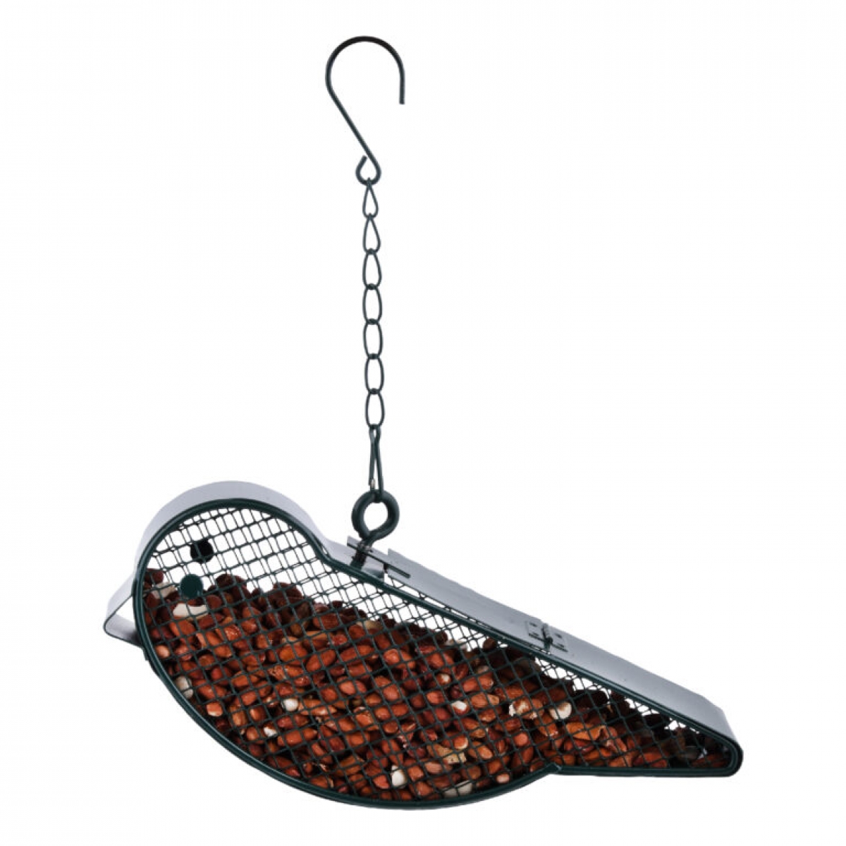 Vtáčie krmítko do záhrady má kovový zásobník, do ktorého môžete umiestniť orechy alebo obilia. Dvierka otvorte ľahko uvoľnením závesného krúžku.
