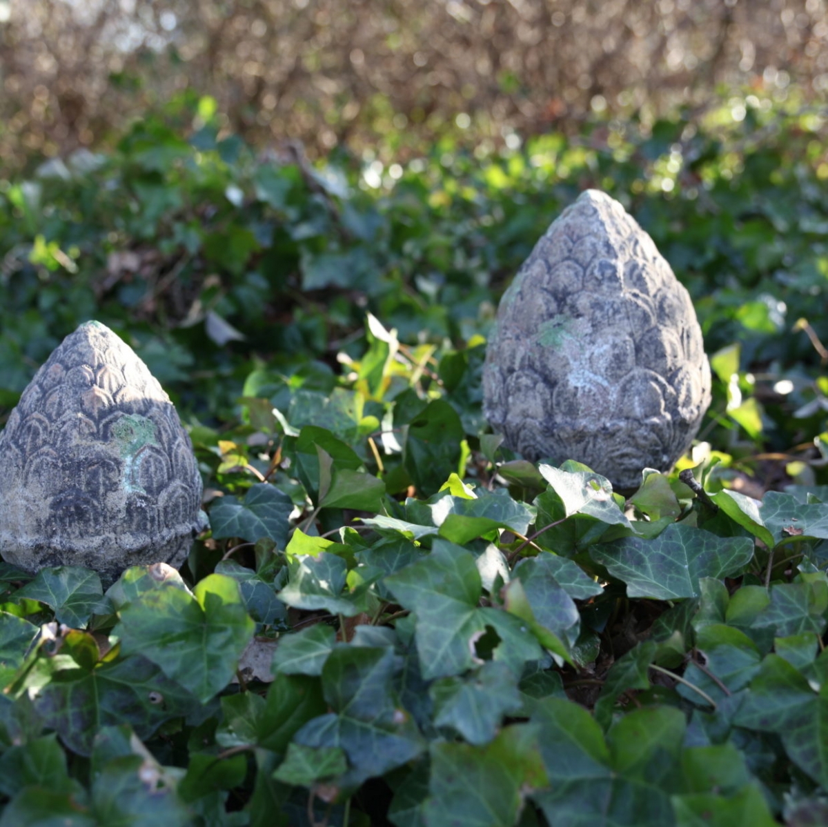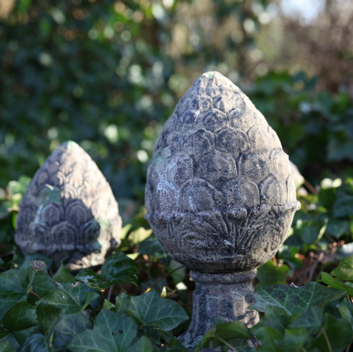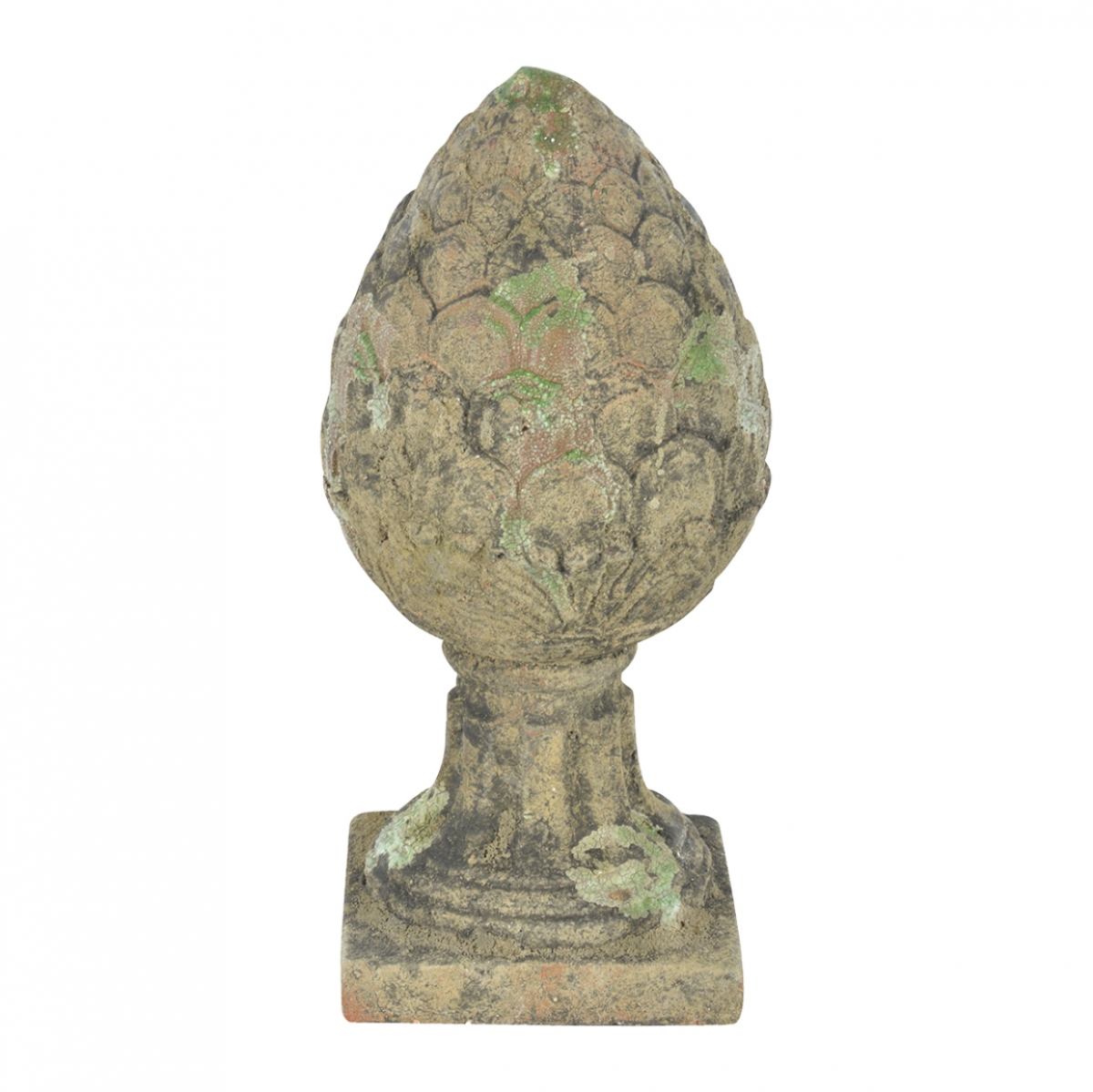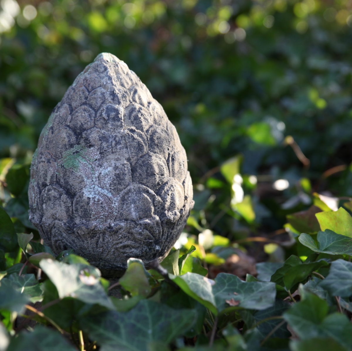 Povrch tejto záhradnej dekorácie je navyše opatrený špecifickou patinou, vďaka ktorej vyzerá šiška na podstavci, ako vytesaná z kameňa a dlhé desaťročia zabudnutá v zarastajúcej záhrade. Dokonca má na sebe aj veľmi realistický mach a lišajníky.