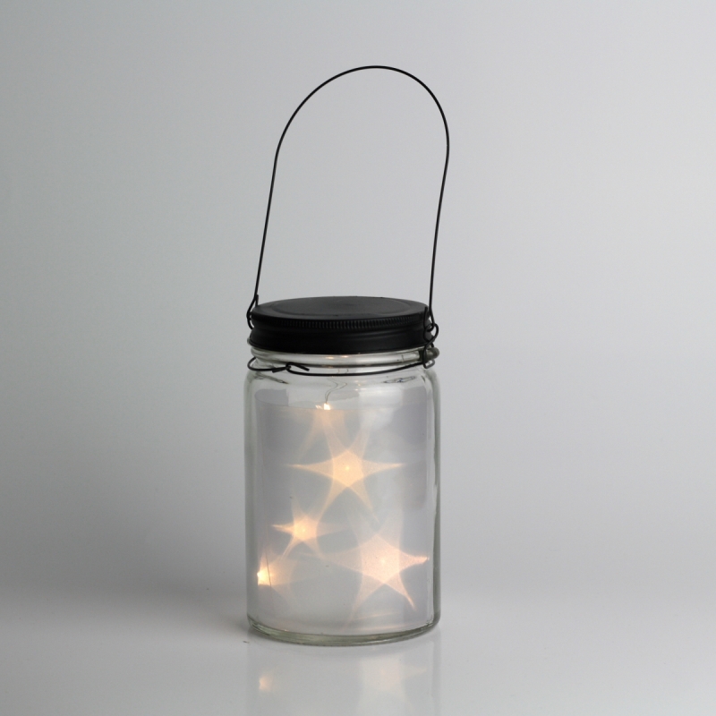 Zahradná lampáš / osvetlenie 15cm v tvare pripomínajúci zaváracie pohári so závitom. Pohár je doplnená o drôtená ucho pre jednoduché premiestnenie. Pod viečkom je ukrytý priestor na 3 tužkové batérie.