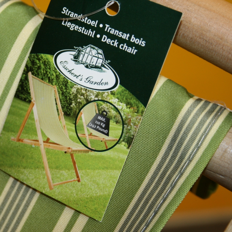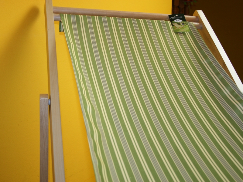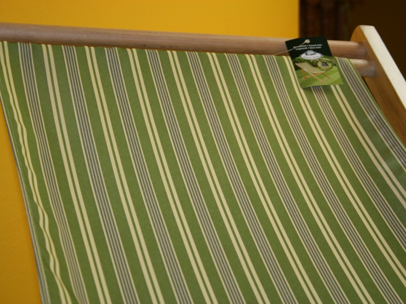 Lehátko má drevenú konštrukciu, je polohovateľné, ľahko sa skladá aj prenáša. Látka má zelenú farbu s dekorom tmavých a svetlých prúžkov.