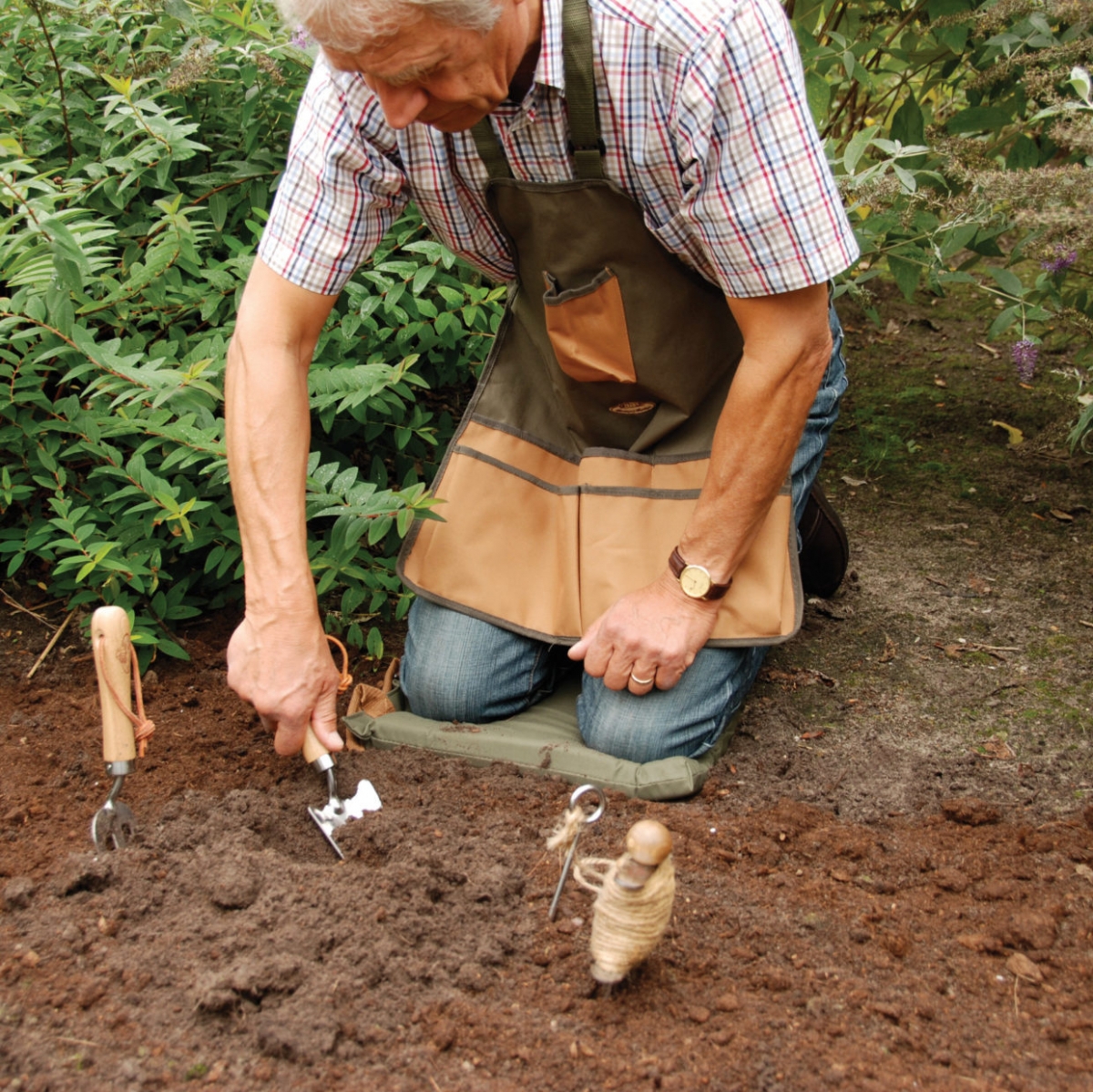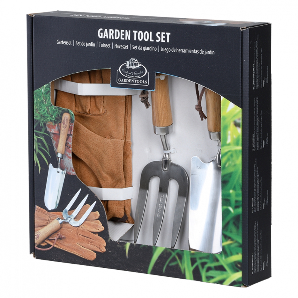 Sada záhradného náradia obsahuje jednu oceľovú lopatku so špicatou čepeľou a drevenou rukoväťou, jedny oceľové ručné hrabličky s tromi hrotmi, a tiež drevenou rukoväťou a pár kožených záhradných rukavíc. Všetko zabalené v krabici.