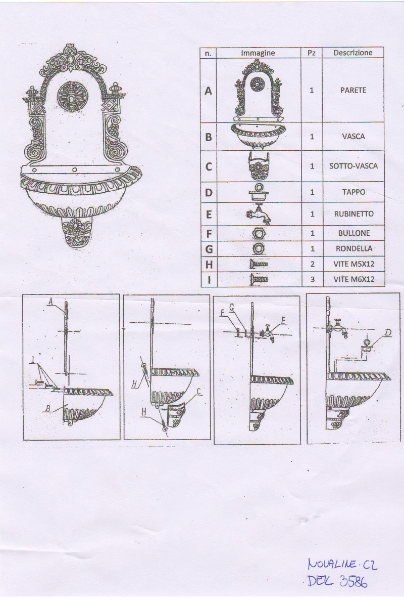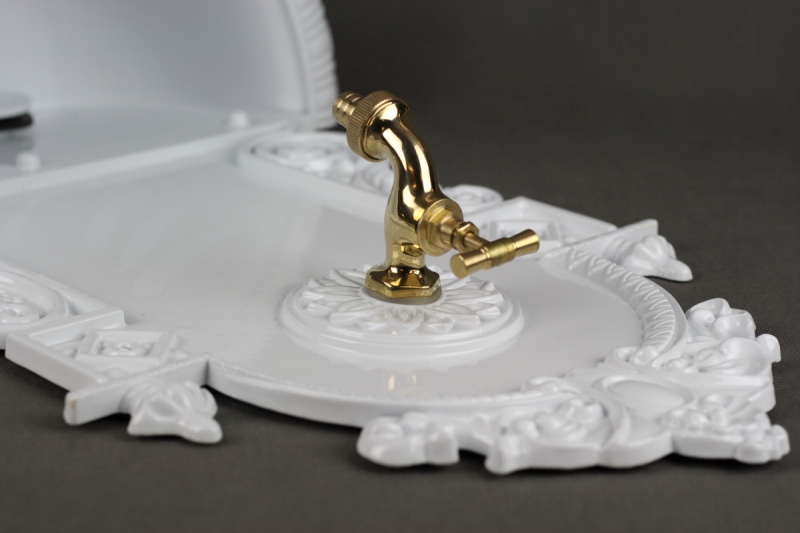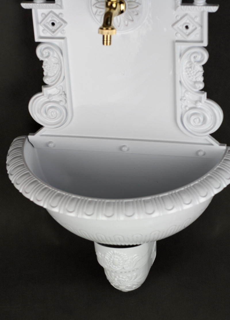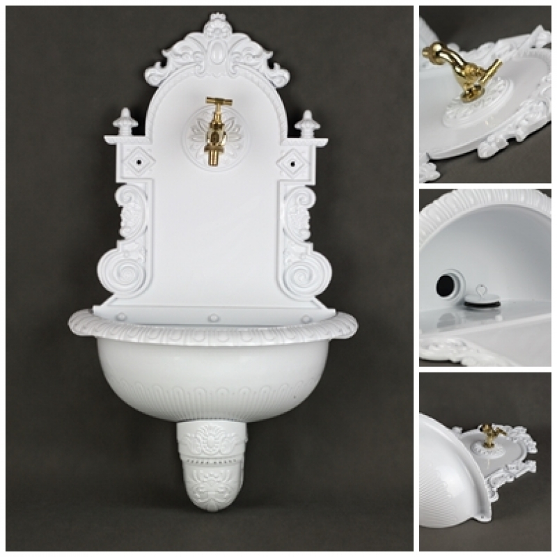 Záhradné nástenné umývadlo 75x44cm v jedinečnom prevedení s bohatým zdobením. Punc luxusu umývadlu dodáva tiež zlatý kohútik, ktorý zaisťuje prívod vôd.