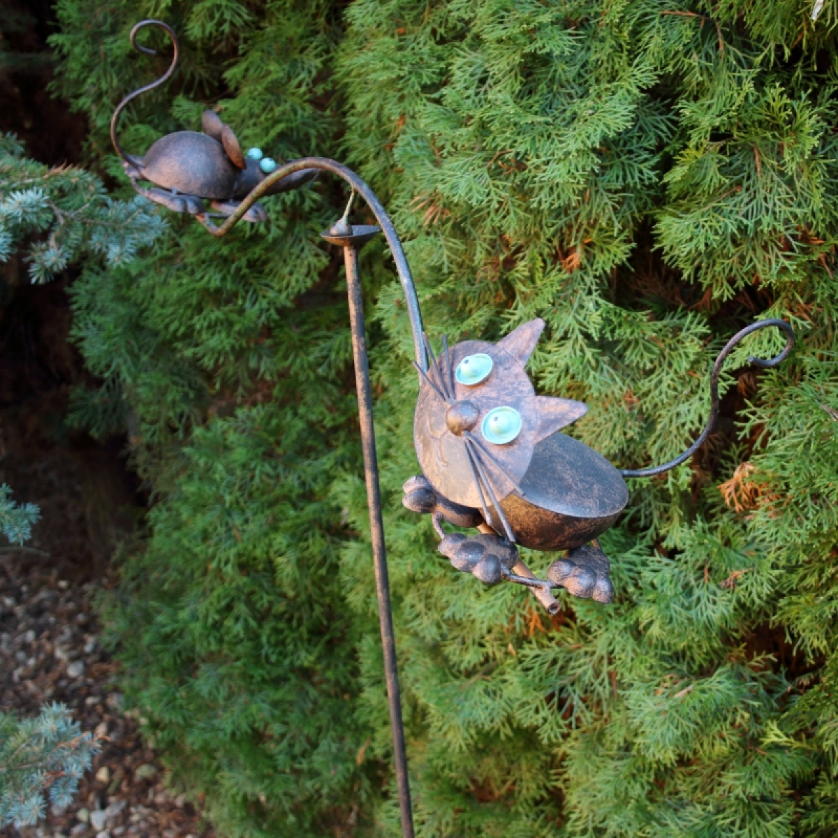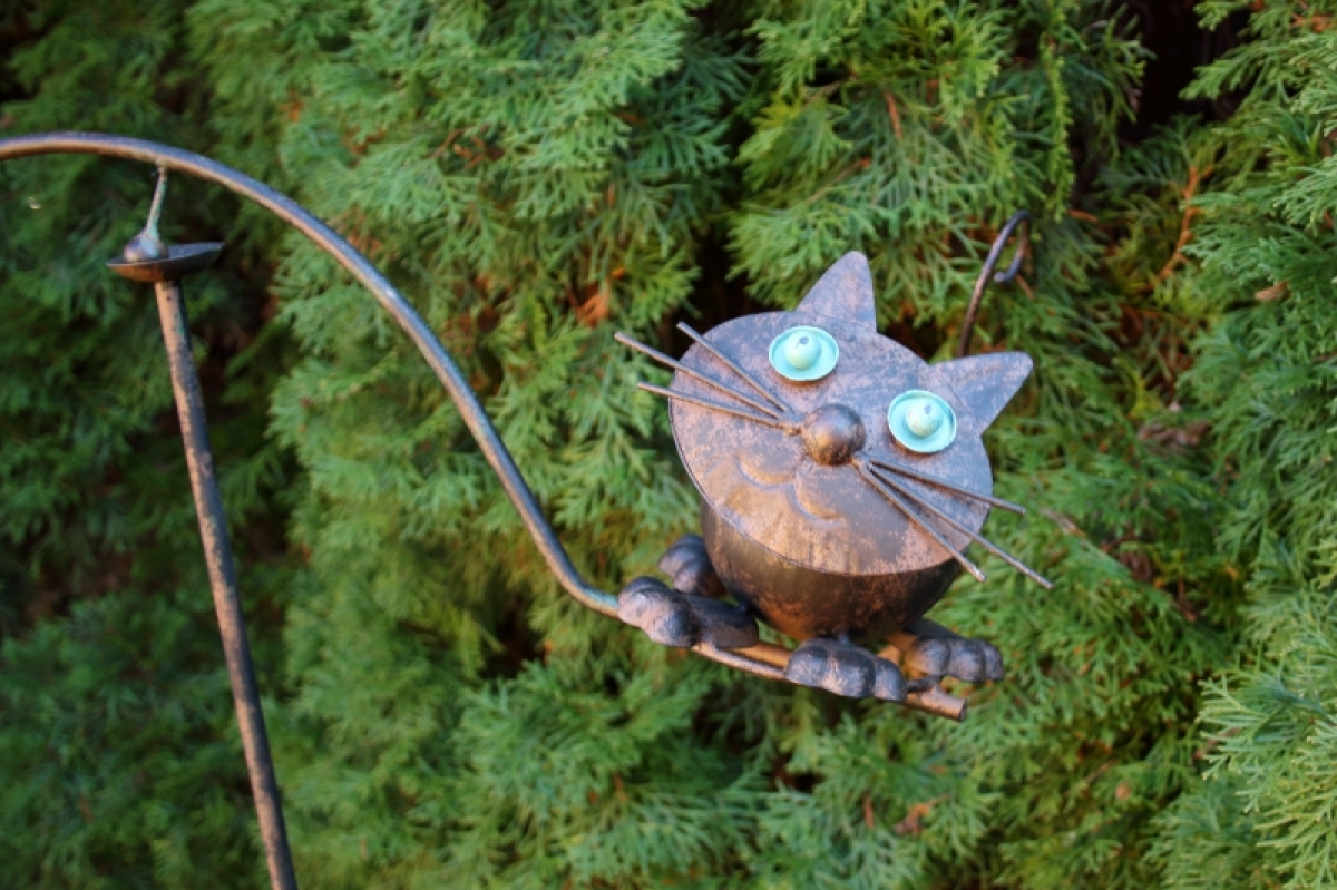 Zahradní dekorace 140cm kočka, byla vyřazená z důvodu chybějícího spodní části zápichu. Vrchní část, na které se dokorace točí nechybí.