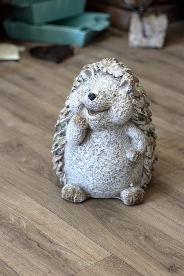 Ježek má roztomilý obličej a bodlinky jsou vytvořeny pomocí kamínků. Bude mu to slušet v každé zahrádce i u vstupu do domu.