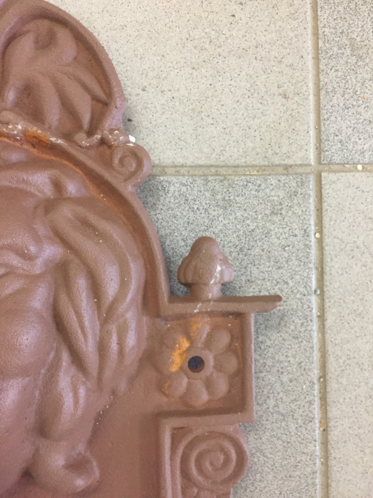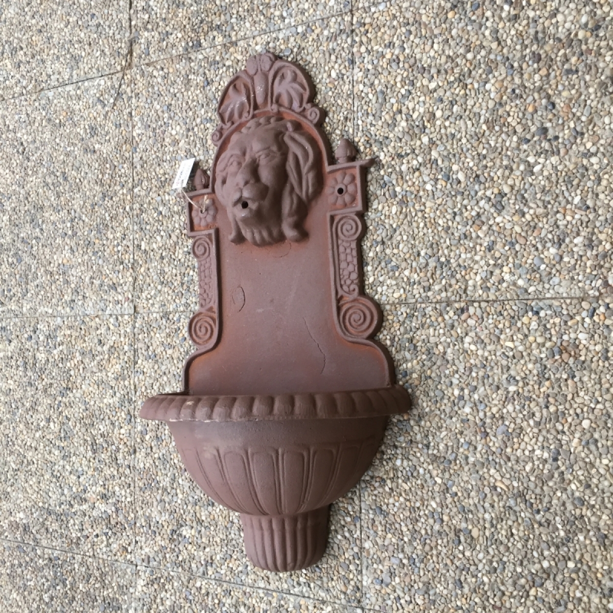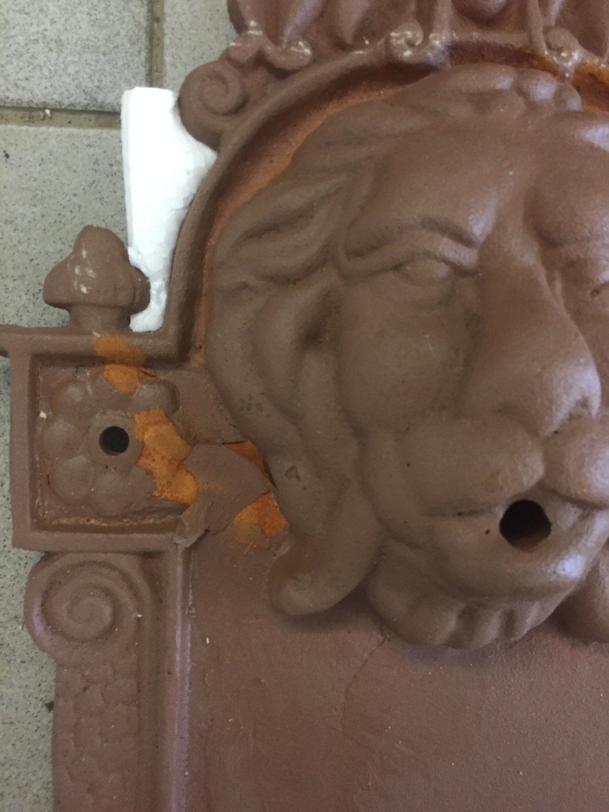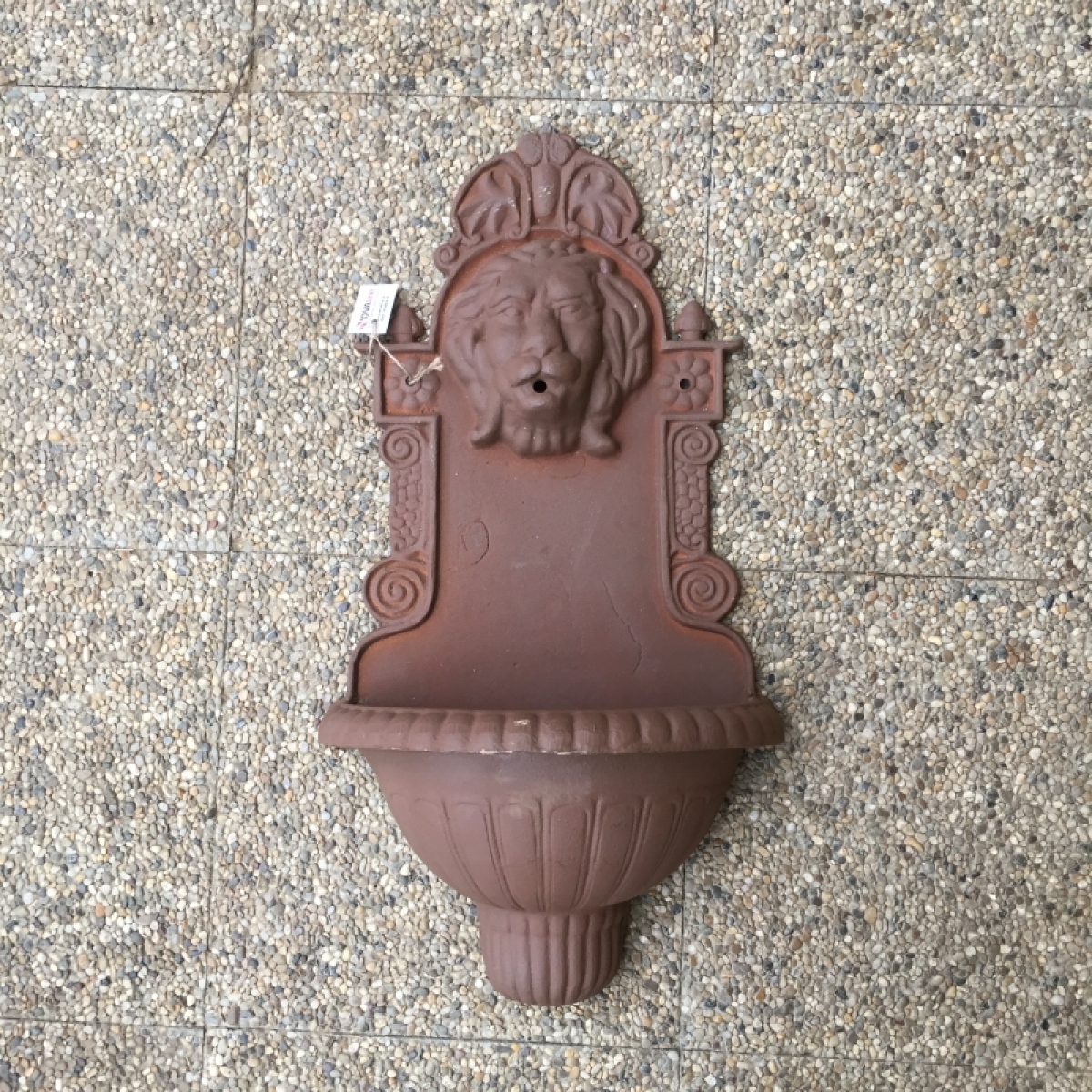 Voda stylově vytéká z tlamy lva do litinového umyvadla.