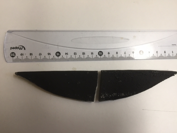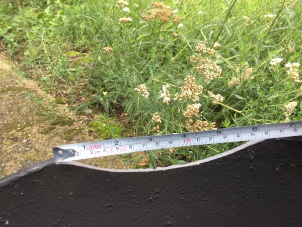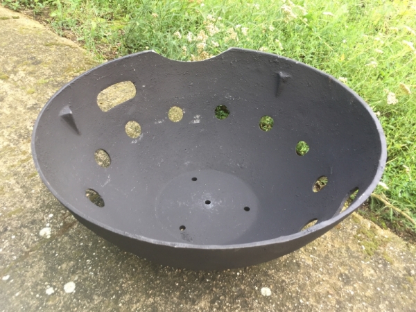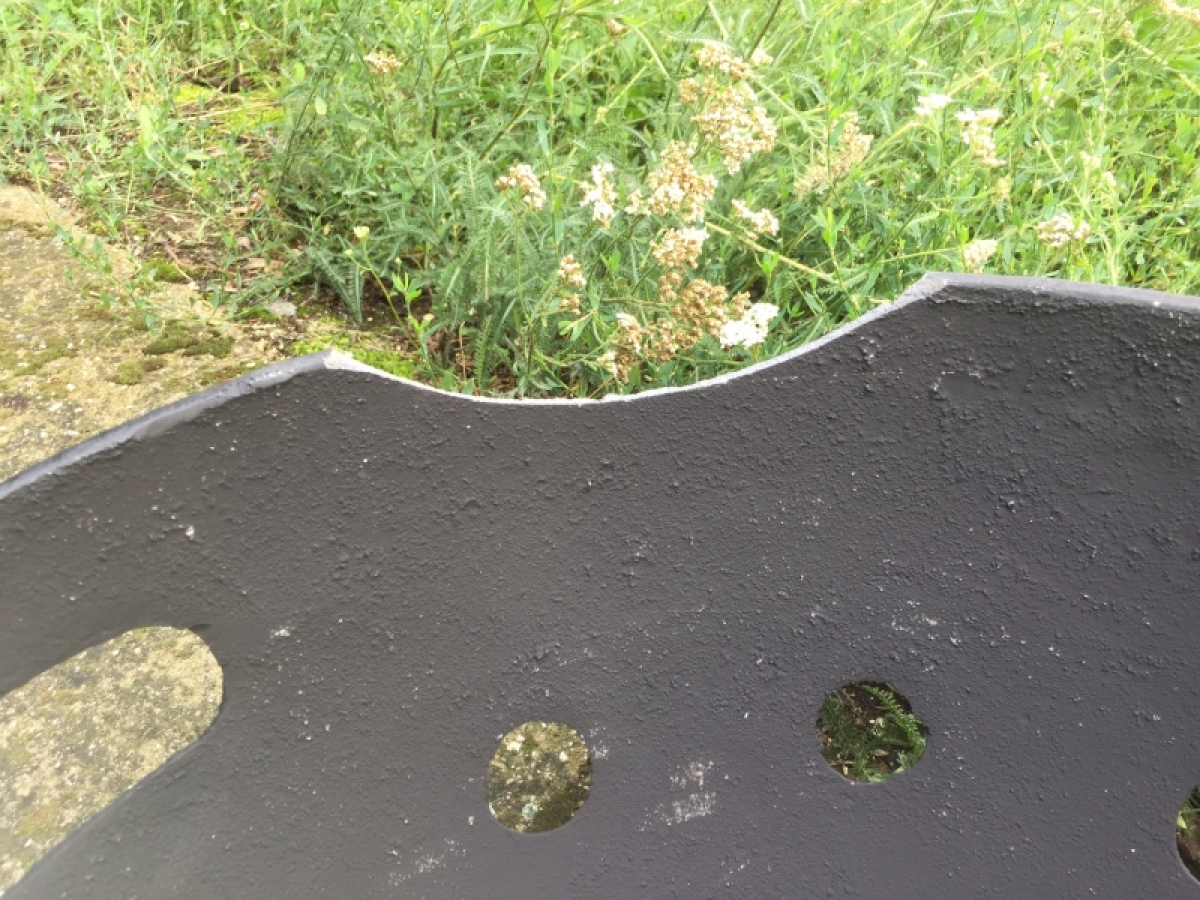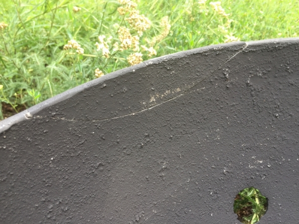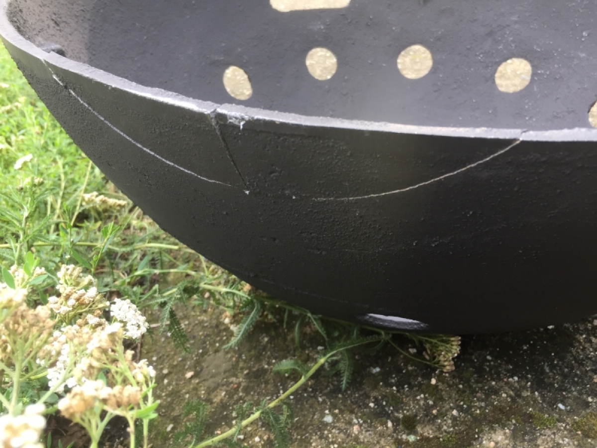 Na horním lemu došlo v délce 13cm k odštípnutí okraje, do hloubky 3,3cm. I bez opravy je ohniště krásné, funkční a plně funkční. Ulomené kousky jsou součástí, pokud by se někdo rozhodl kousky přivařit.