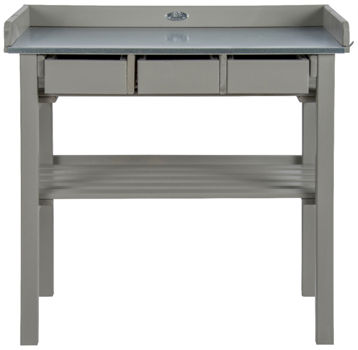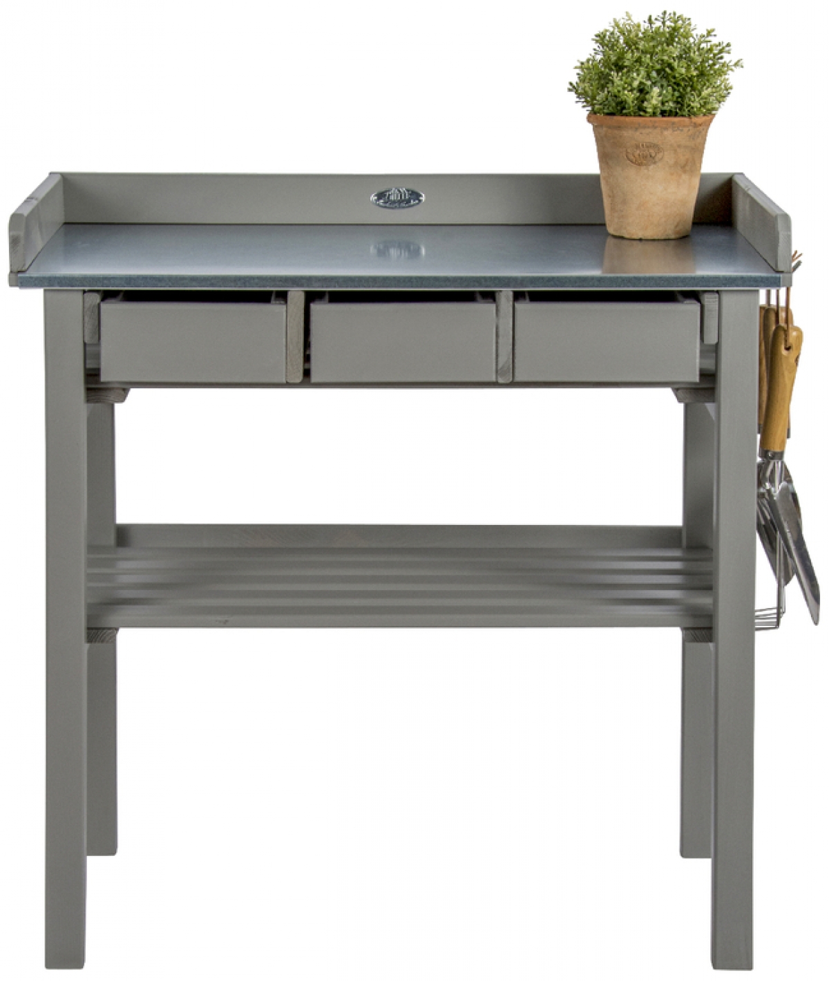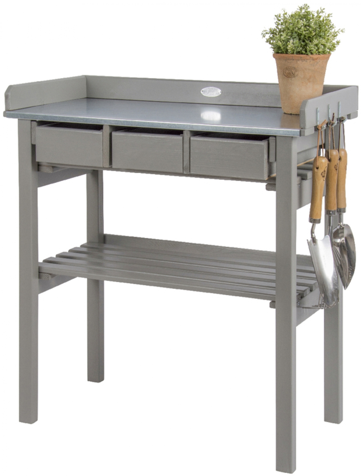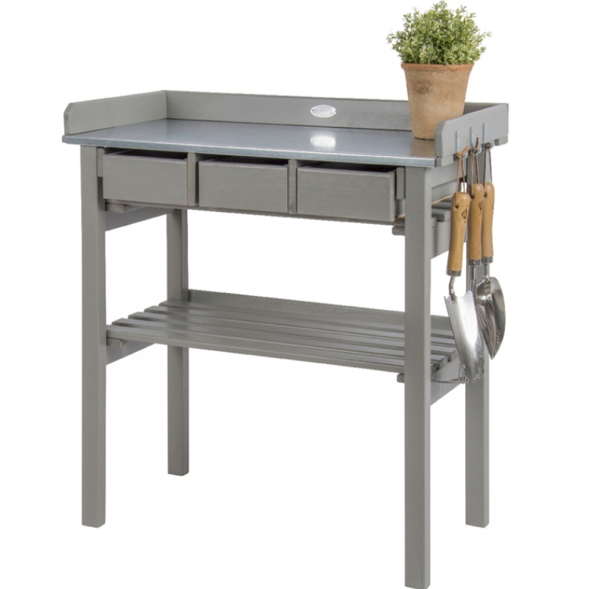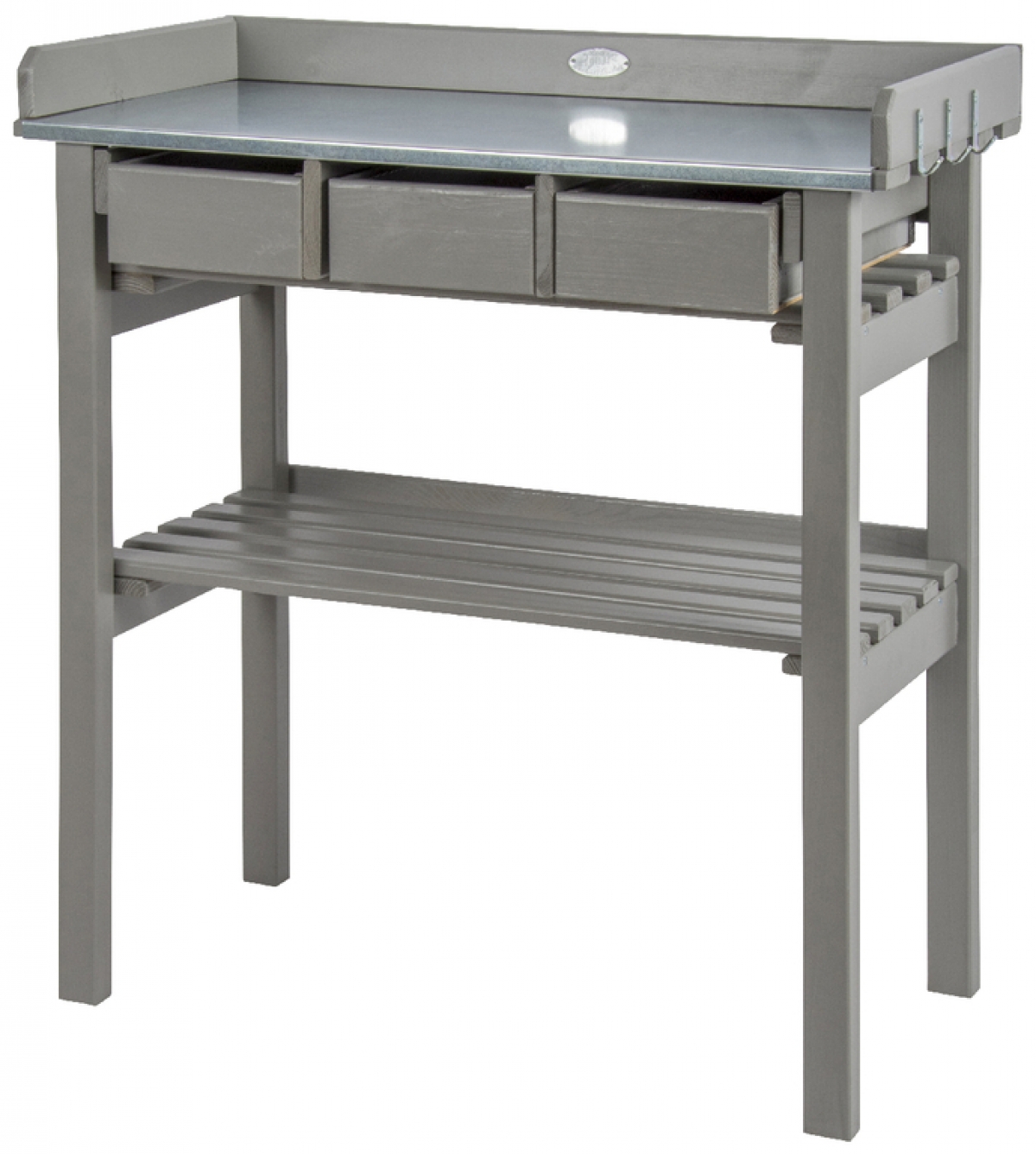 Zinkový povrch na pracovní desce umožňuje snadnou údržbu a zábrany kolem desky zabraňují padání nechtěného odpadu na zem. Praktické výsuvné zásuvky jsou využitelné pro úschovu nářadí a doplňků pro zahradničení. Prostorná plocha pod deskou je vhodná k odkládání větších květináčů a truhlíků.