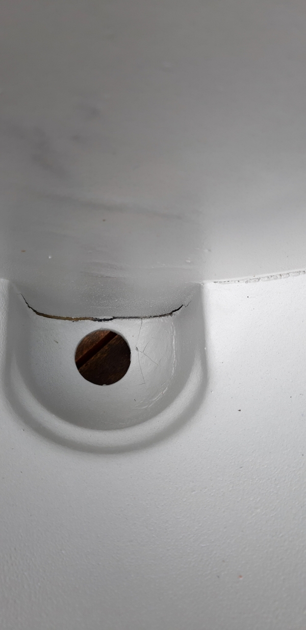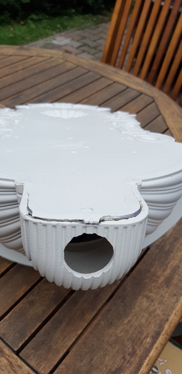 Zahradní umyvadlo bez kohoutku, vyřazené z důvodu poškození v místě odtoku vody. Opravitelné zasilikonováním. Pokud ale nebudete zahradní umyvadlo napojovat na odpad a hodláte zahradní umyvadlo využívat jako výlevku a umyvadlo na zahradě na oplachování ovoce a rukou a nenapojovat na běžný odpad. Poškození je vyibrazené na obrázku č.7 a 8.