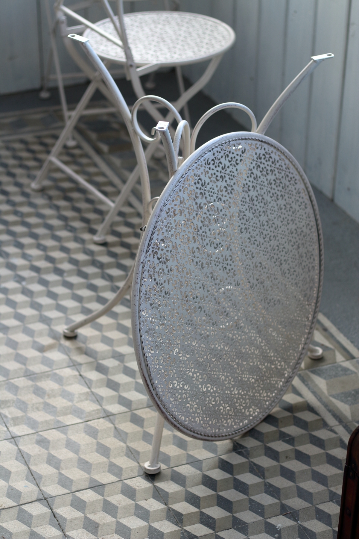 Záhradný nábytok v podobe kovového stola s dvoma stoličkami