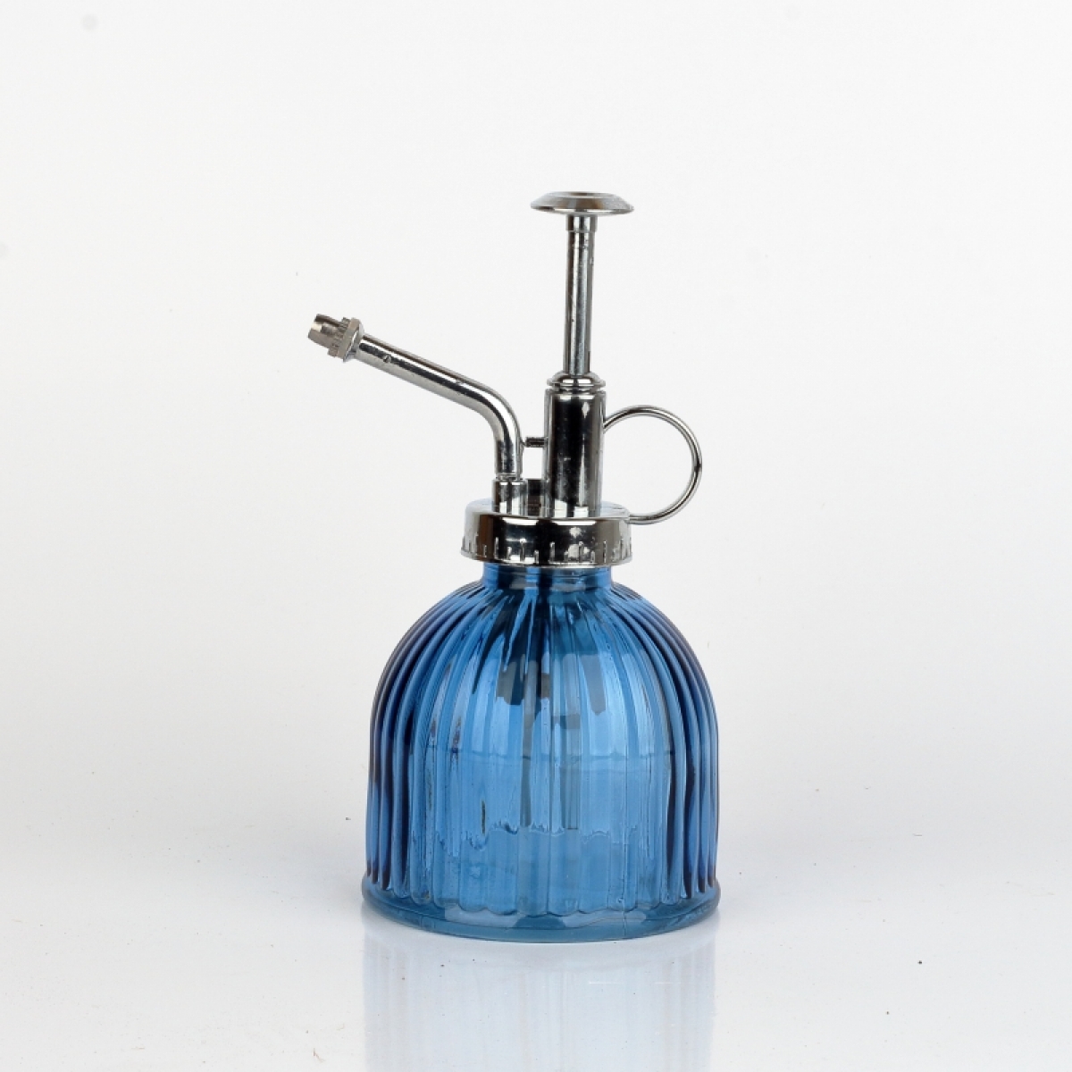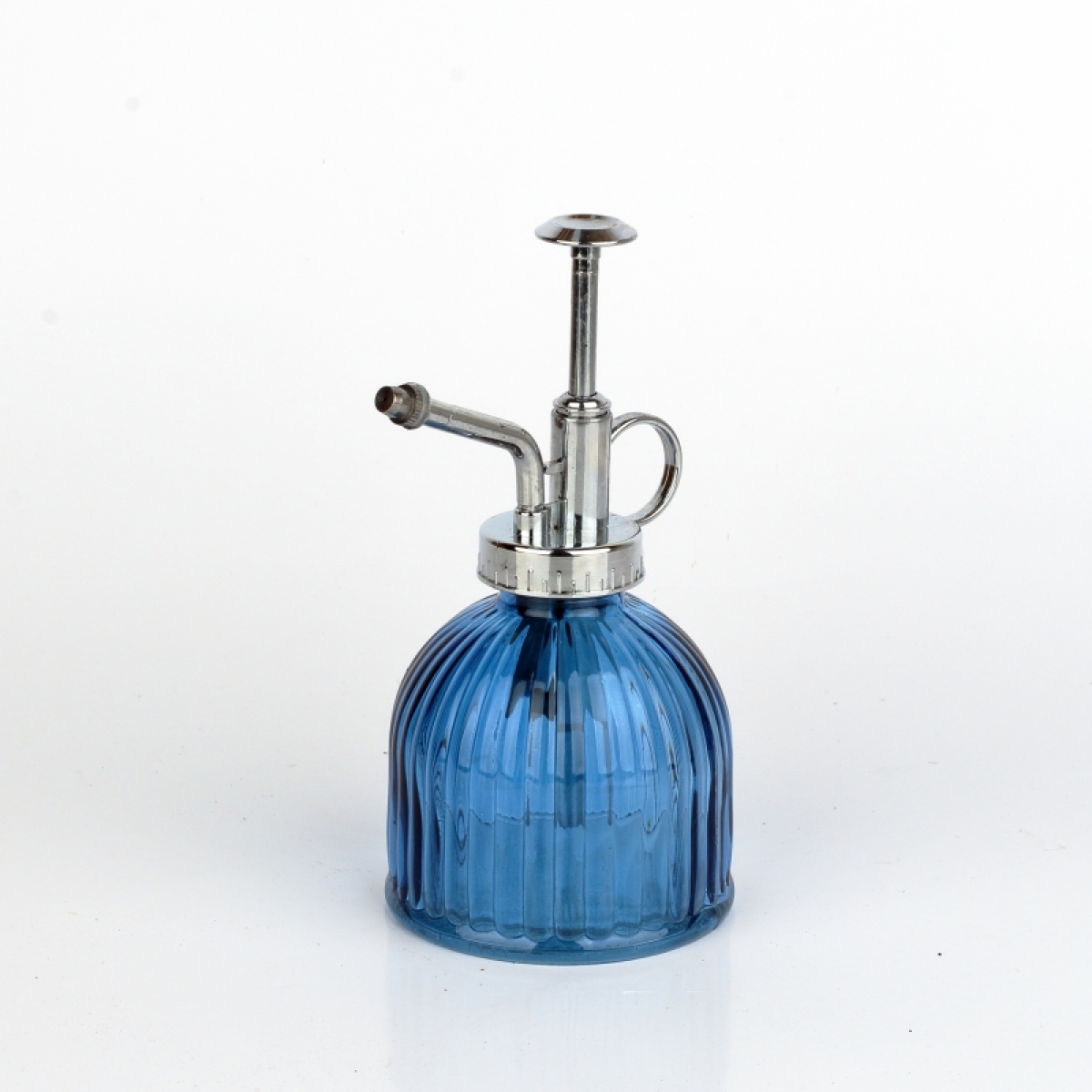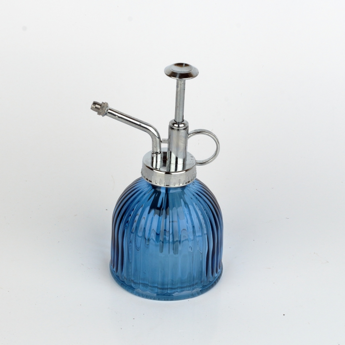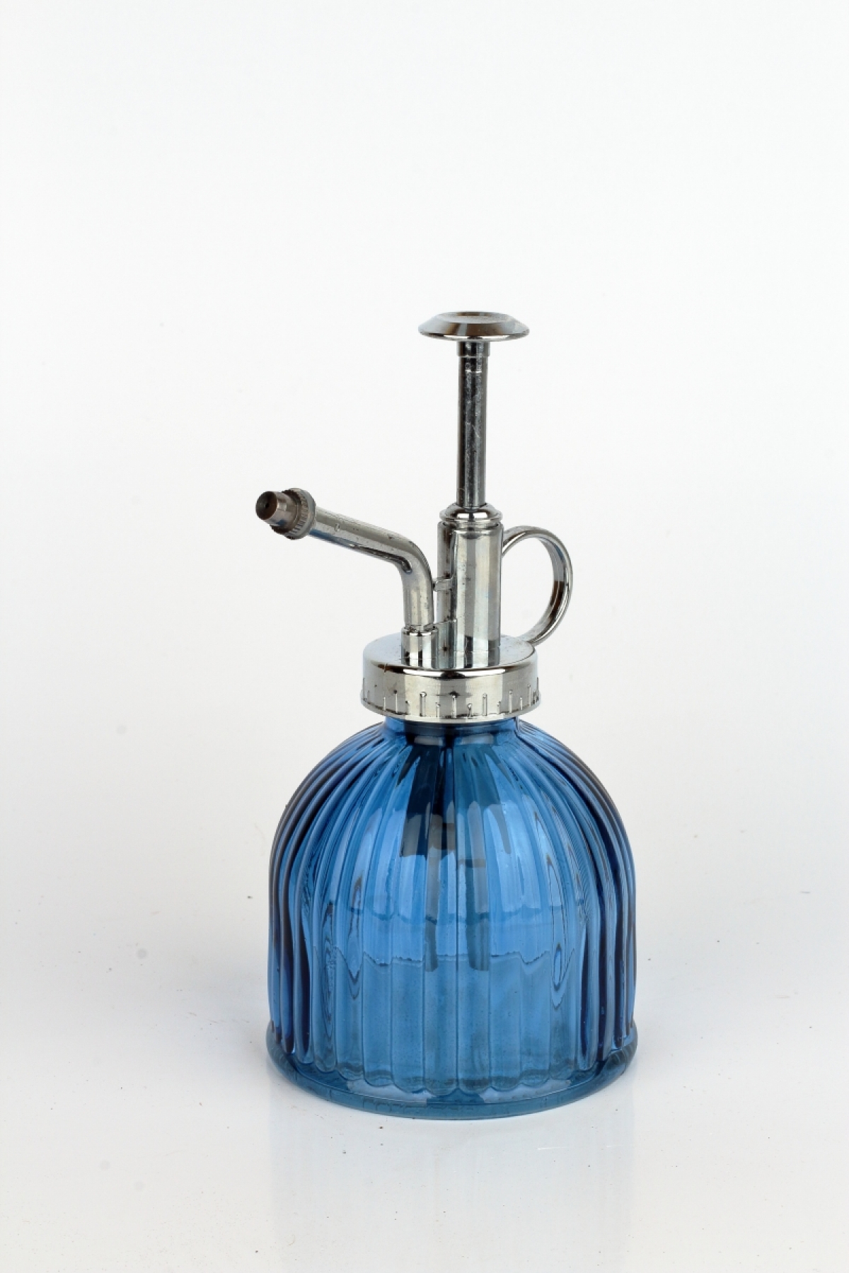 Záhradný rozprašovač na kvety vyrobený zo skla v tmavo modrej farbe.