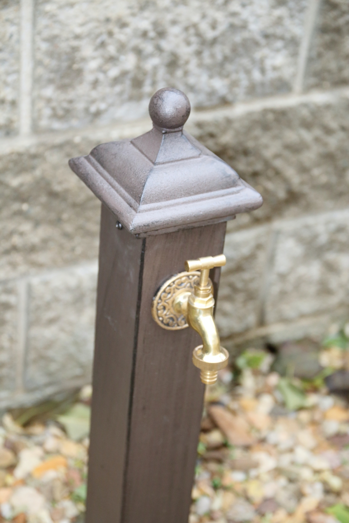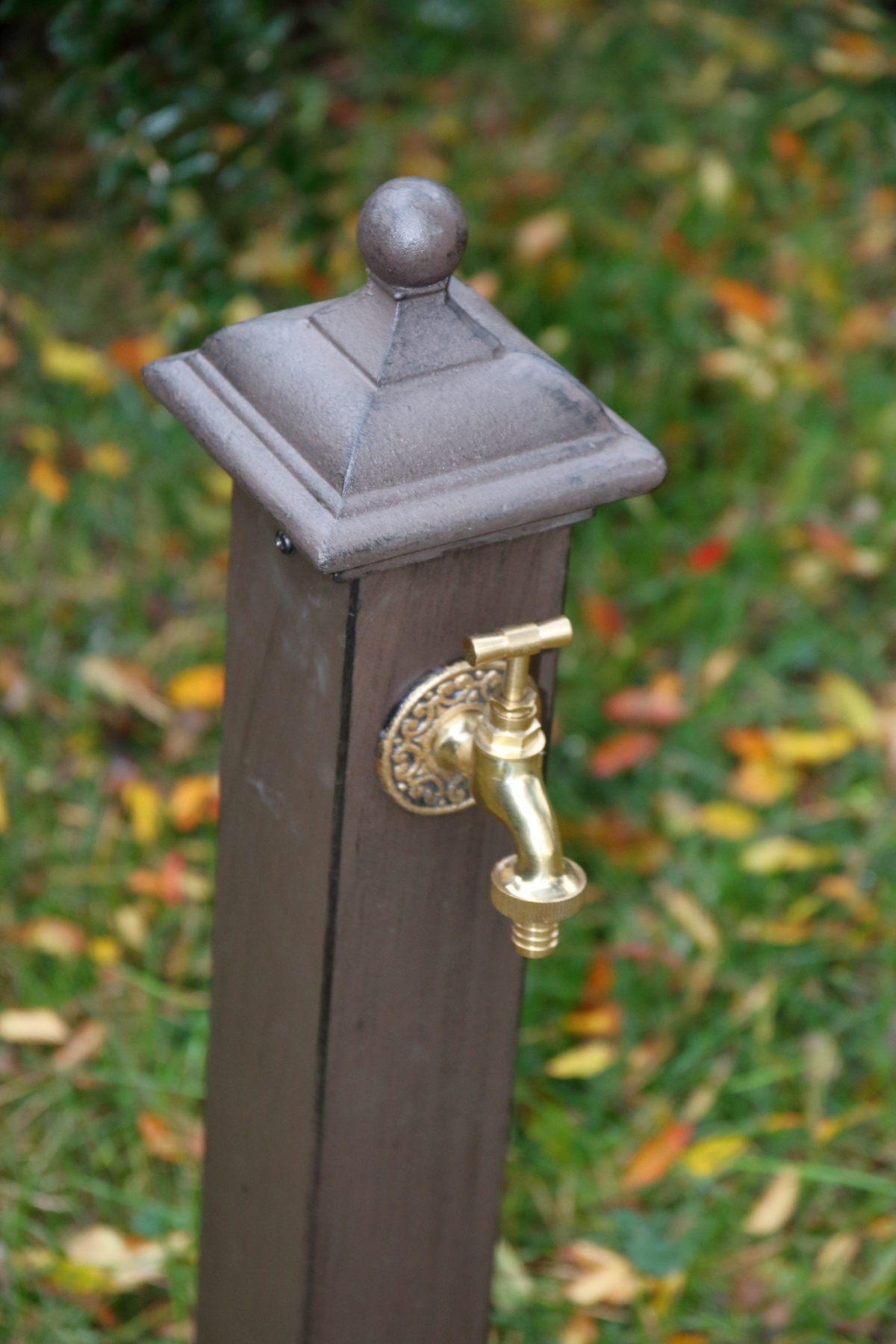 Pre pripojenie na vodovodný rad je potrebné nahradiť maticu držiacu záhradný kohútik 1/2" z vnútornej časti stĺpika, nahradiť 90° napojením, do ktorého následne napojíte (cca 53cm od zeme) prívod vody vstupujúcej zo zeme do podesty.