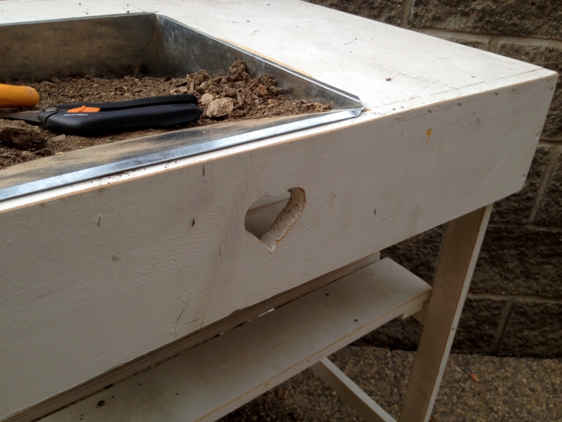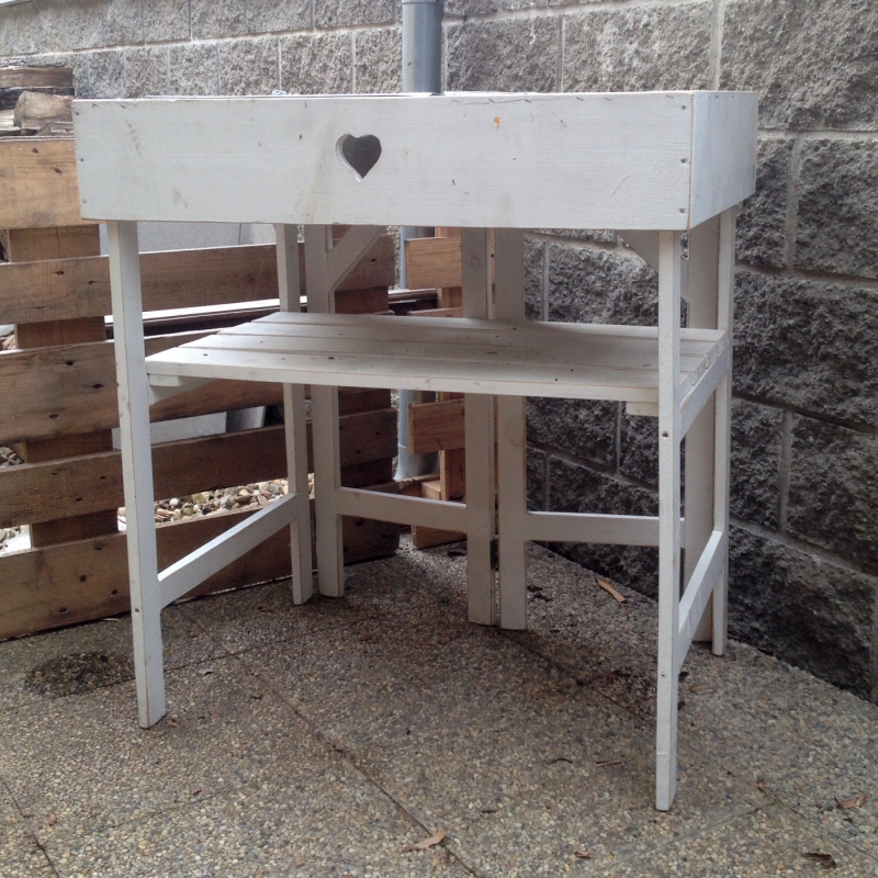 Rozměry: stolek je vysoký 86cm a široký 78cm. Ve výšce 52cm má poličku o rozměru 78x58cm. Jeho horní část zdobená vyřezávaným srdíčkem je vysoká 15cm a je v ní vsazen výklopný zásobník 41x41cm na hlínu, vyrobený z plechu.