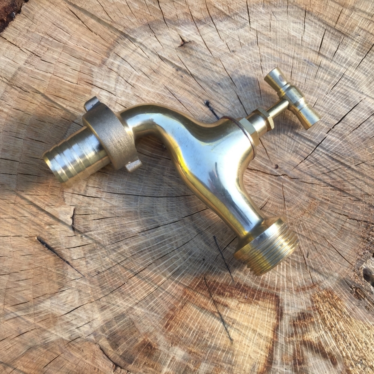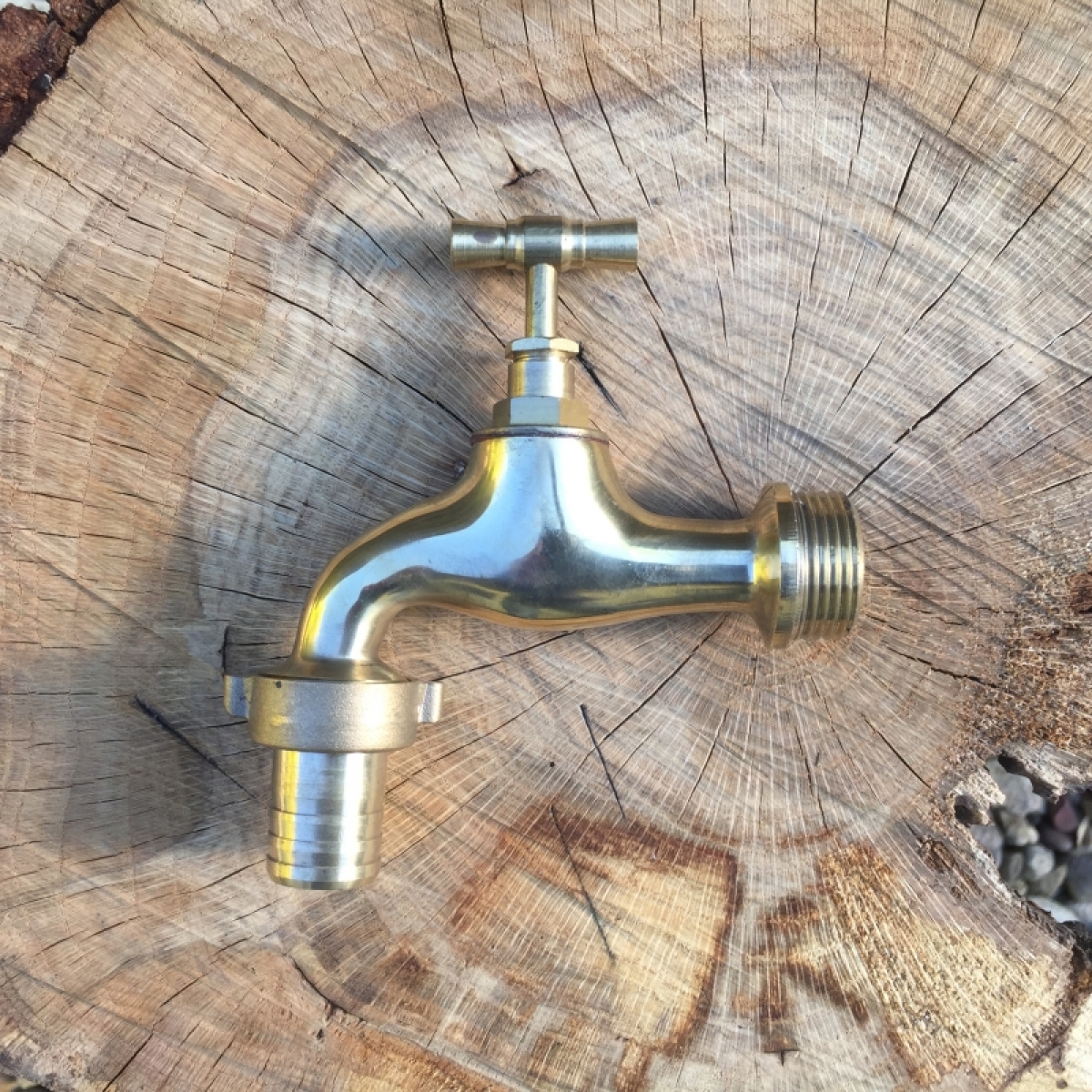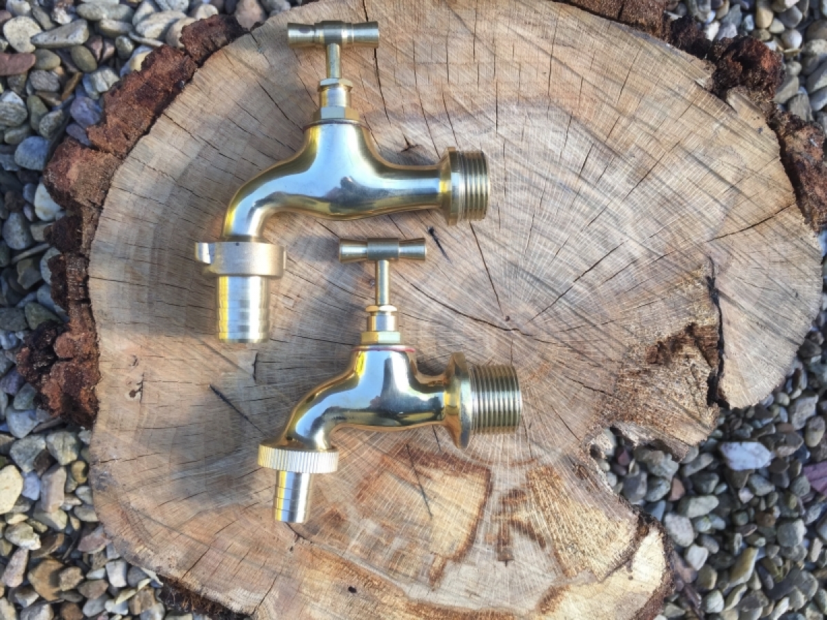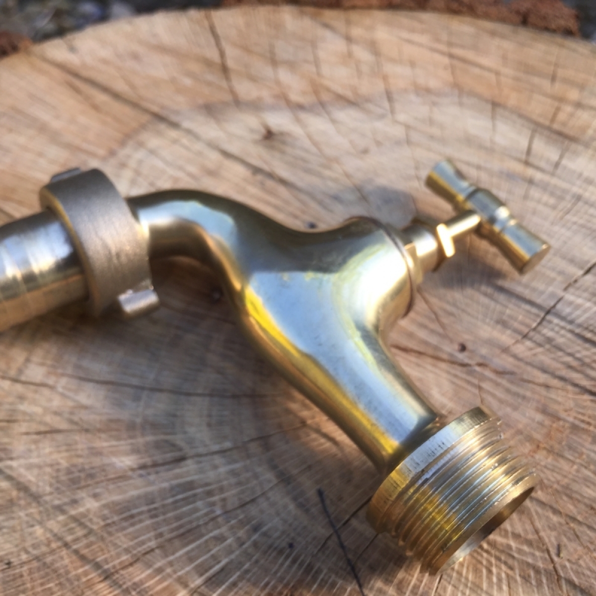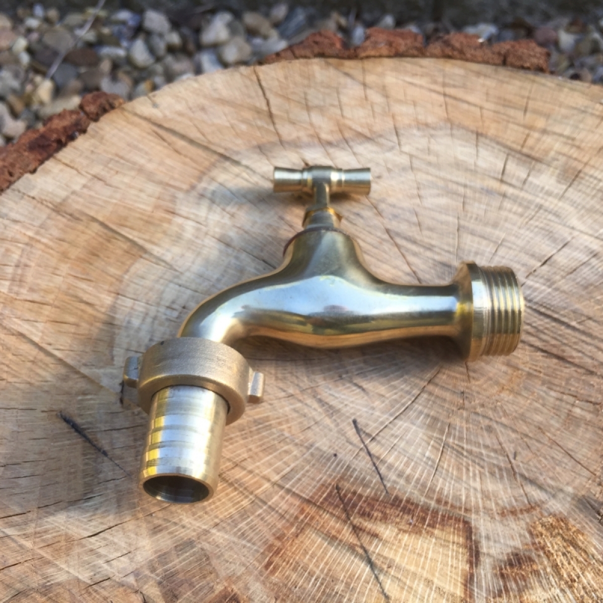 Zahradní vodovodní kohoutek o délce 107 mm a celkové výšce 115 mm.