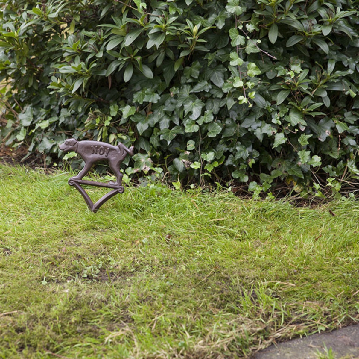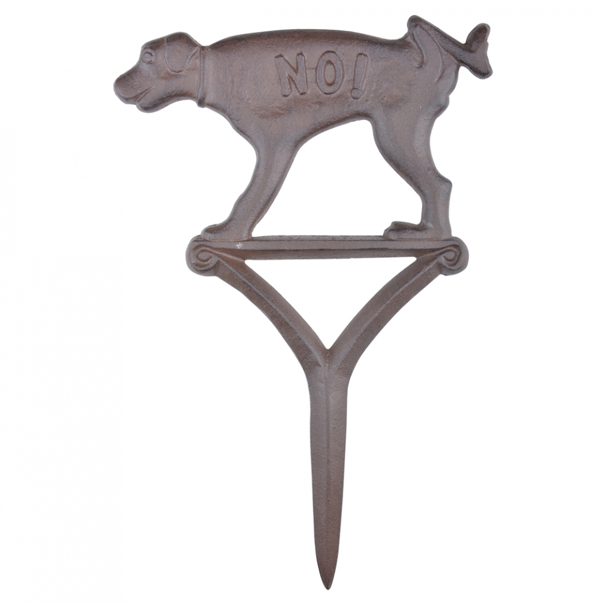 Liatinový zápich s dekoráciou psa ako upozornenie na zákaz venčenie psov.