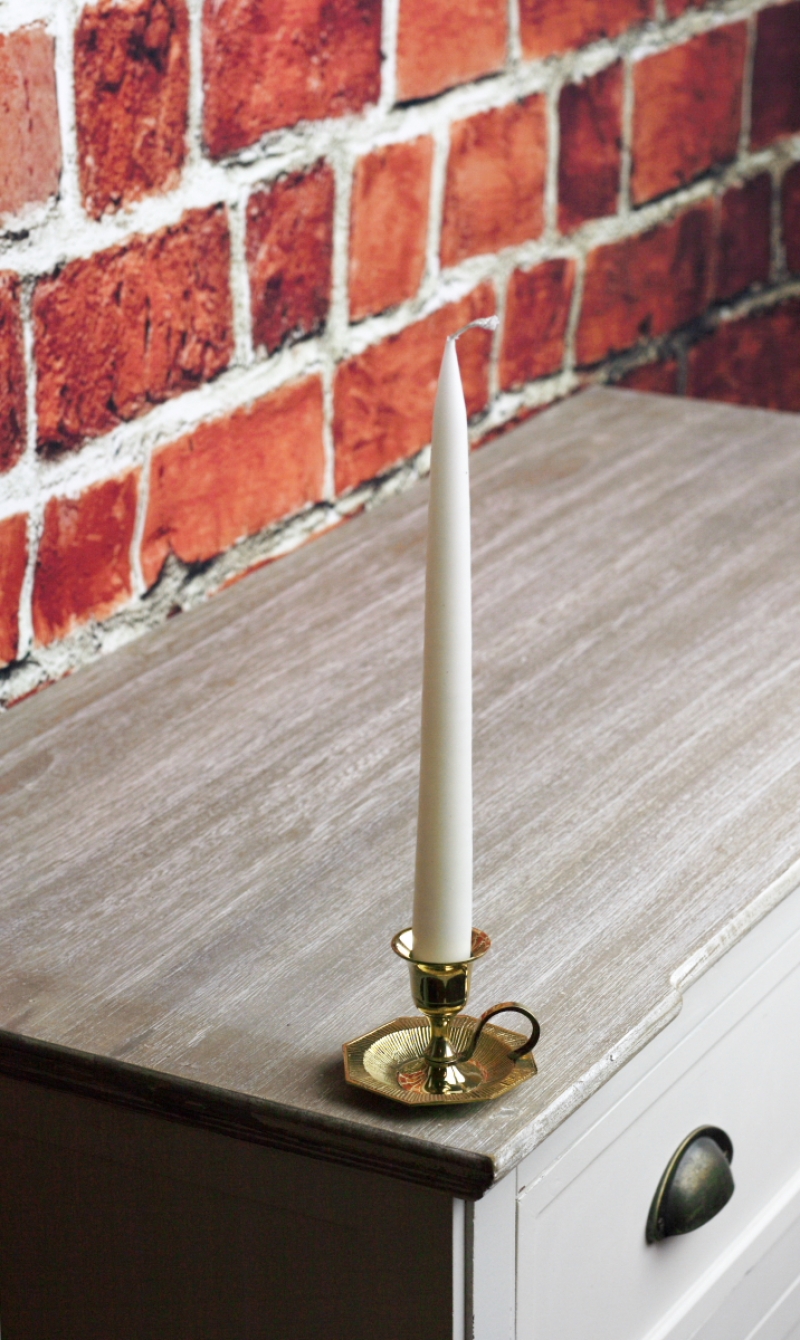 Krásny mosadzný svietnik s uškom na prenášanie je štýlovým doplnkom do vidiecky ladených interiérov.