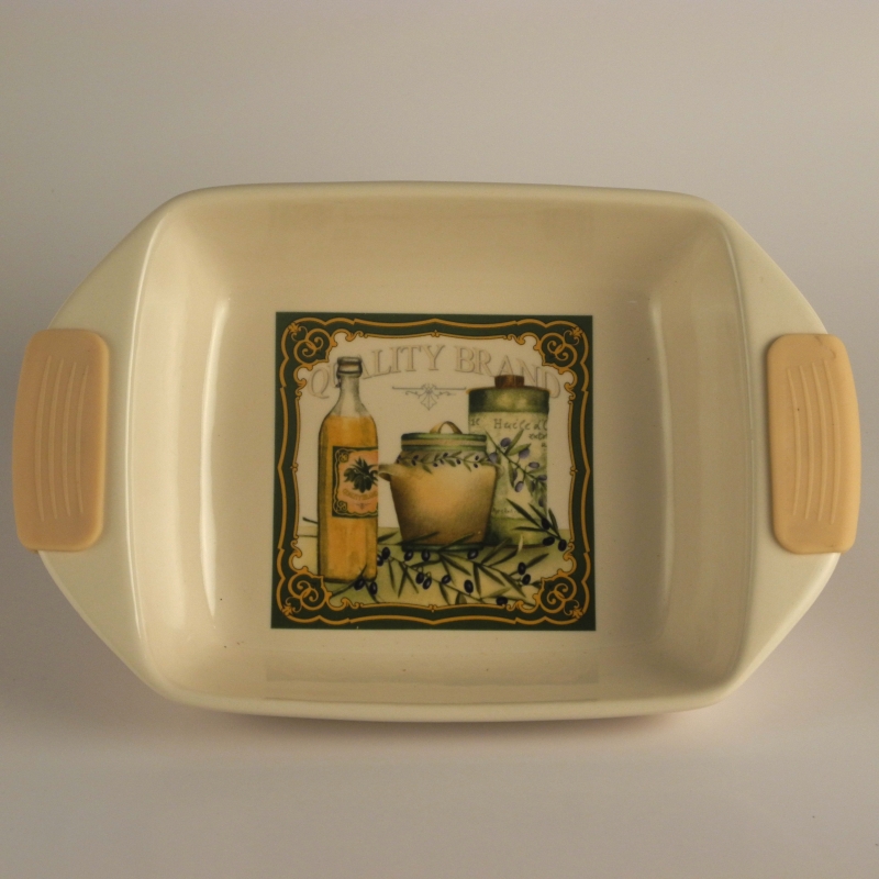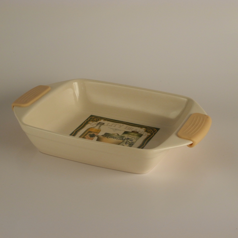 Zapékací mísa s velikostí 32 x 21 5,8 cm je opatřena praktickými gumovými konci. Nemusíte se tedy bát popálení. Tyto gumové úchytky lze velmi snadno sejmout. Zapékací mísa je vyrobená z keramiky a hezky ji zdobí barevný kuchyňský motiv. Hodí se na zapékání vašich oblíbených pokrmů, můžete ji umývat v myčce.