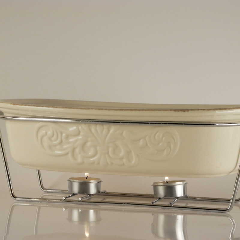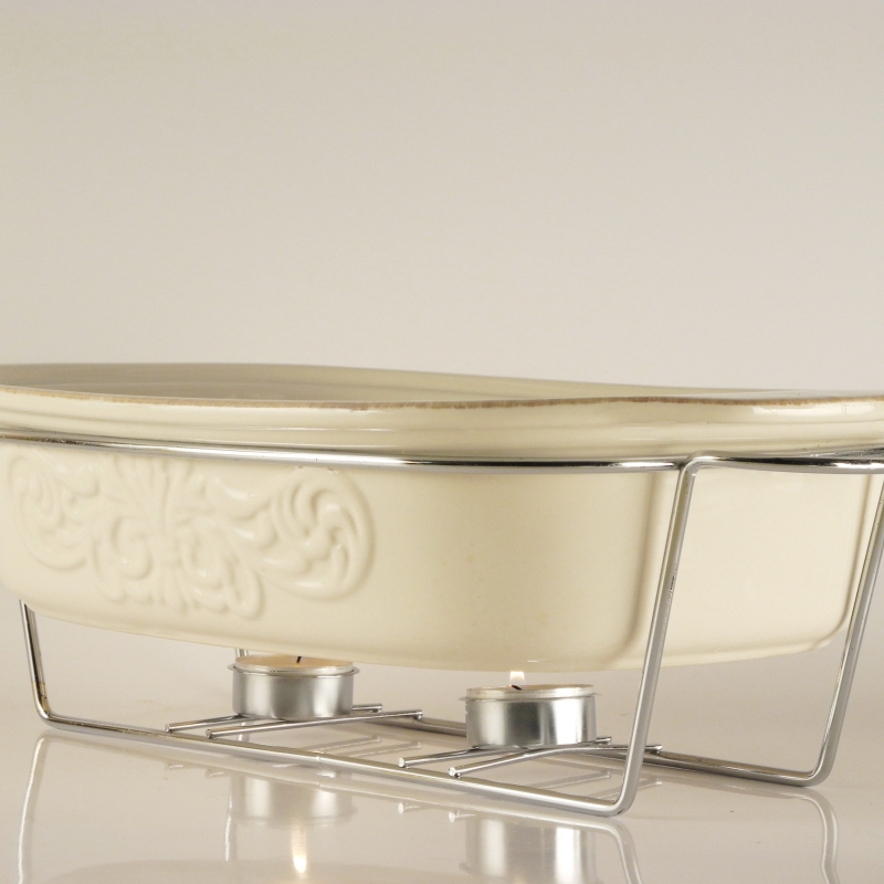 Veľmi zaujímavou a praktickou súčasťou tejto misy je ohrievacie zariadenie. Vďaka dvom čajovým sviečkam, ktoré na neho umiestnite, dosiahnete to, že pokrm v mise rýchlo nevychladne a má stále požadovanú teplotu.