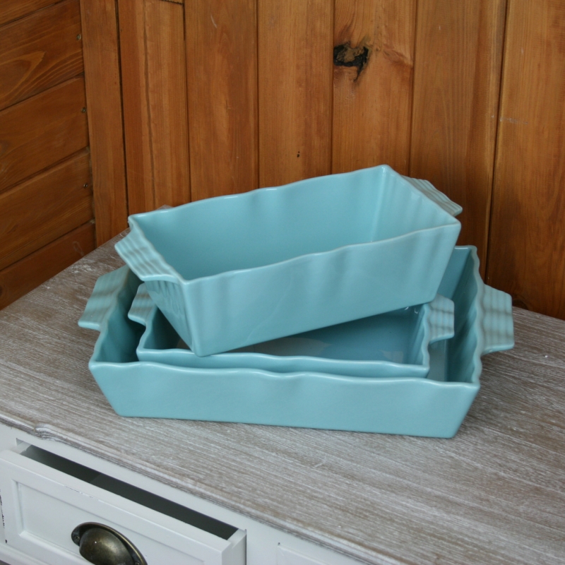 Tyrkysová zapekacia misa z novej kolekcie, ktorá obsahuje zapekacej misy rôznych veľkostí a tvarov.