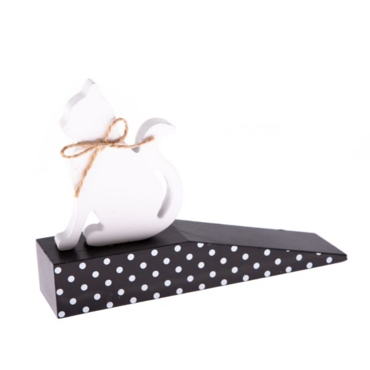 Zarážka dverí s bielou mačkou 17,5 x 4 x 10 cm drevená