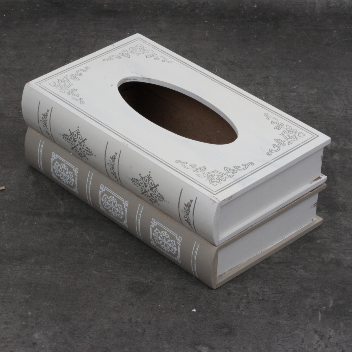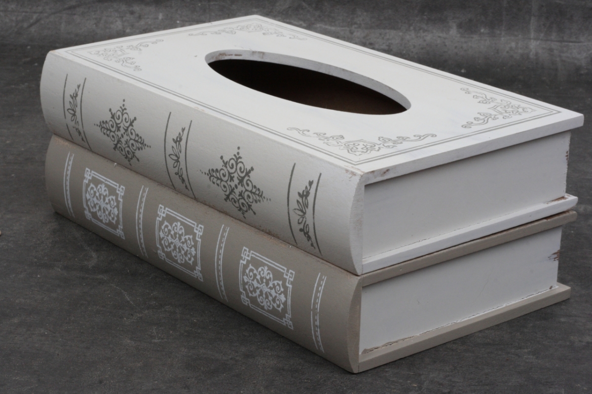 Zásobník na papierové vreckovky alebo kozmetické obrúsky pripomína dve staré odloženej knihy. Na polici či komode tak bude zásobník vyzerať, ako by tam odjakživa patril. Pre výmenu krabice zásobník jednoducho otvoríte.