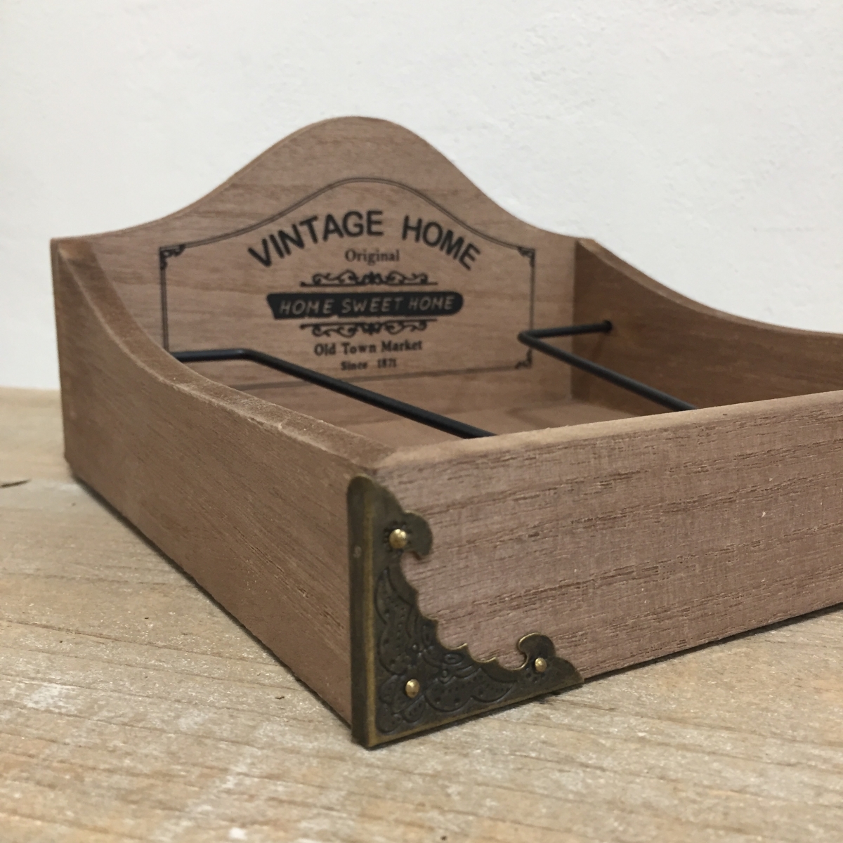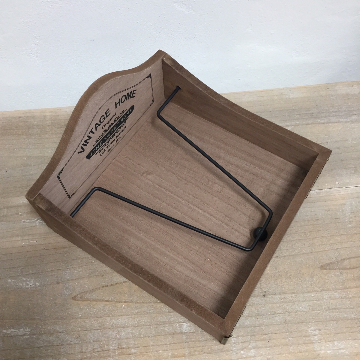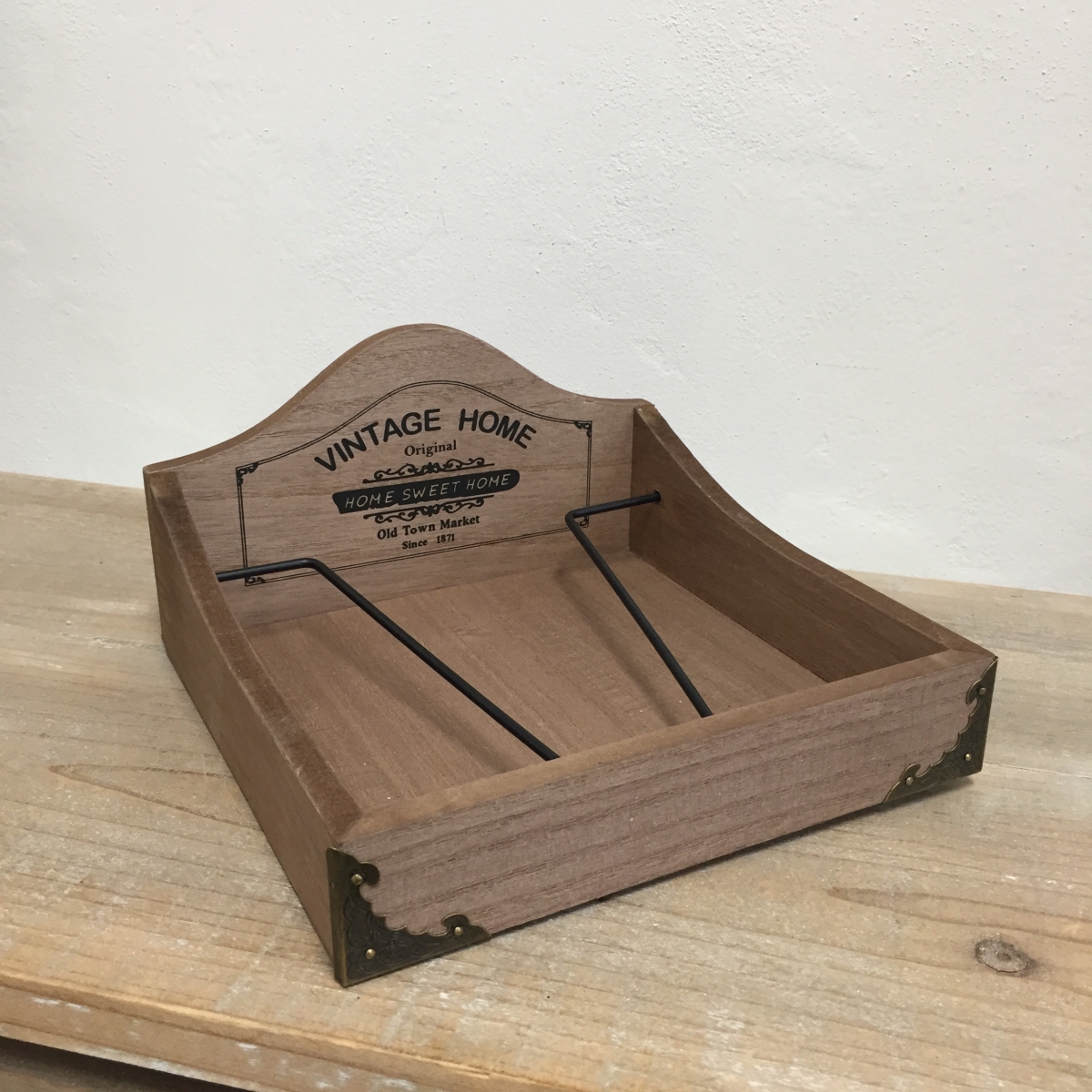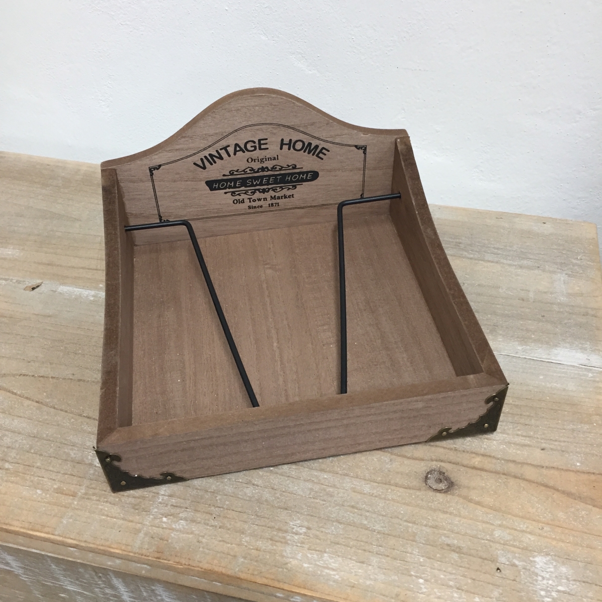 Zásobník na obrúsky vyrobený z dreva s nápisom VINTAGE HOME by nemal chýbať v žiadnej kuchyni. Vďaka praktickému držiaku so závažičkom budú obrúsky pekne ležať na mieste a vy si môžete užívať posedenie vonku, bez otravného sa naháňania za obrúsky poletujúcimi vo vetre.